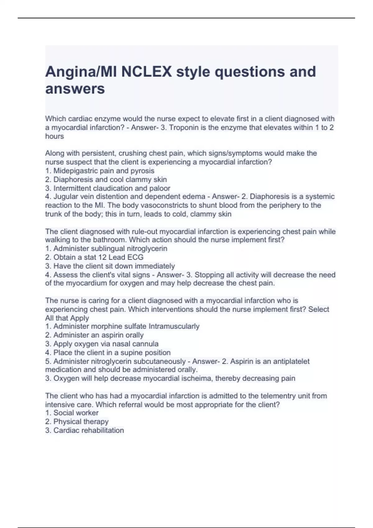 Angina MI NCLEX style questions and answers Graded A