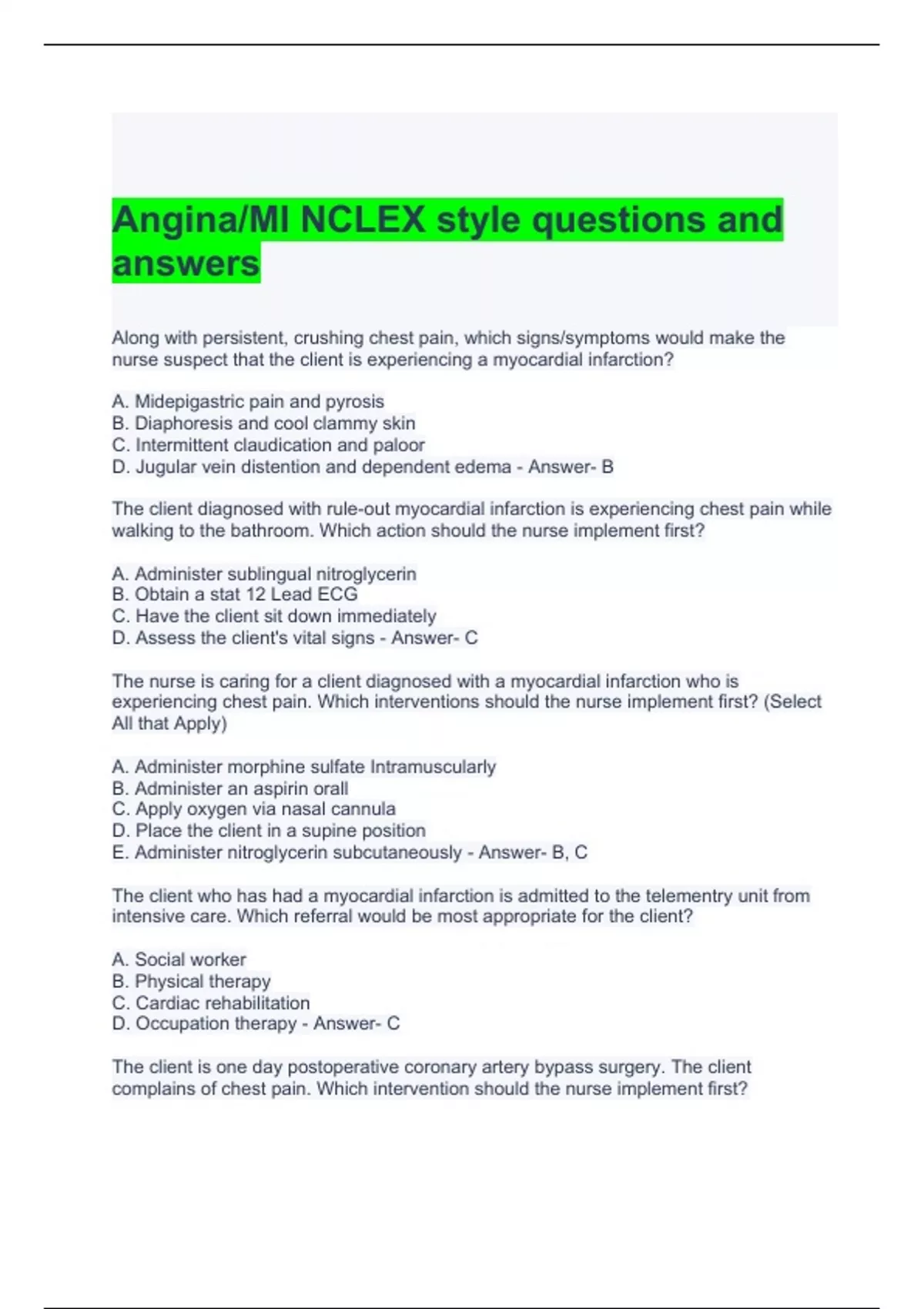 Angina MI NCLEX style questions and answers Graded A