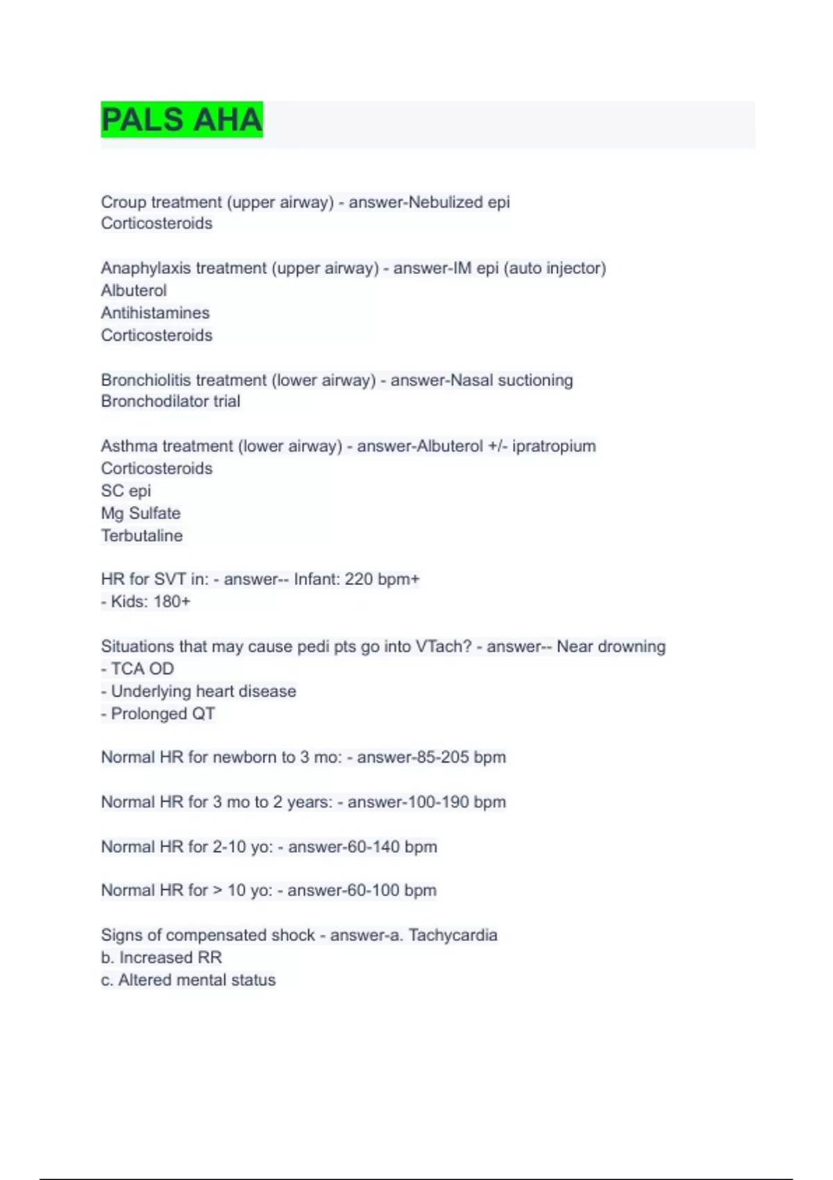 PALS AHA 2023 Croup treatment (upper airway) - answer-Nebulized epi Corticosteroids Anaphylaxis treatment (upper airway) - answer-IM epi (auto injector) Albuterol Antihistamines Corticosteroids Bronchiolitis treatment (lower airway) - answer-Nasal suctioning Bronchodilator trial