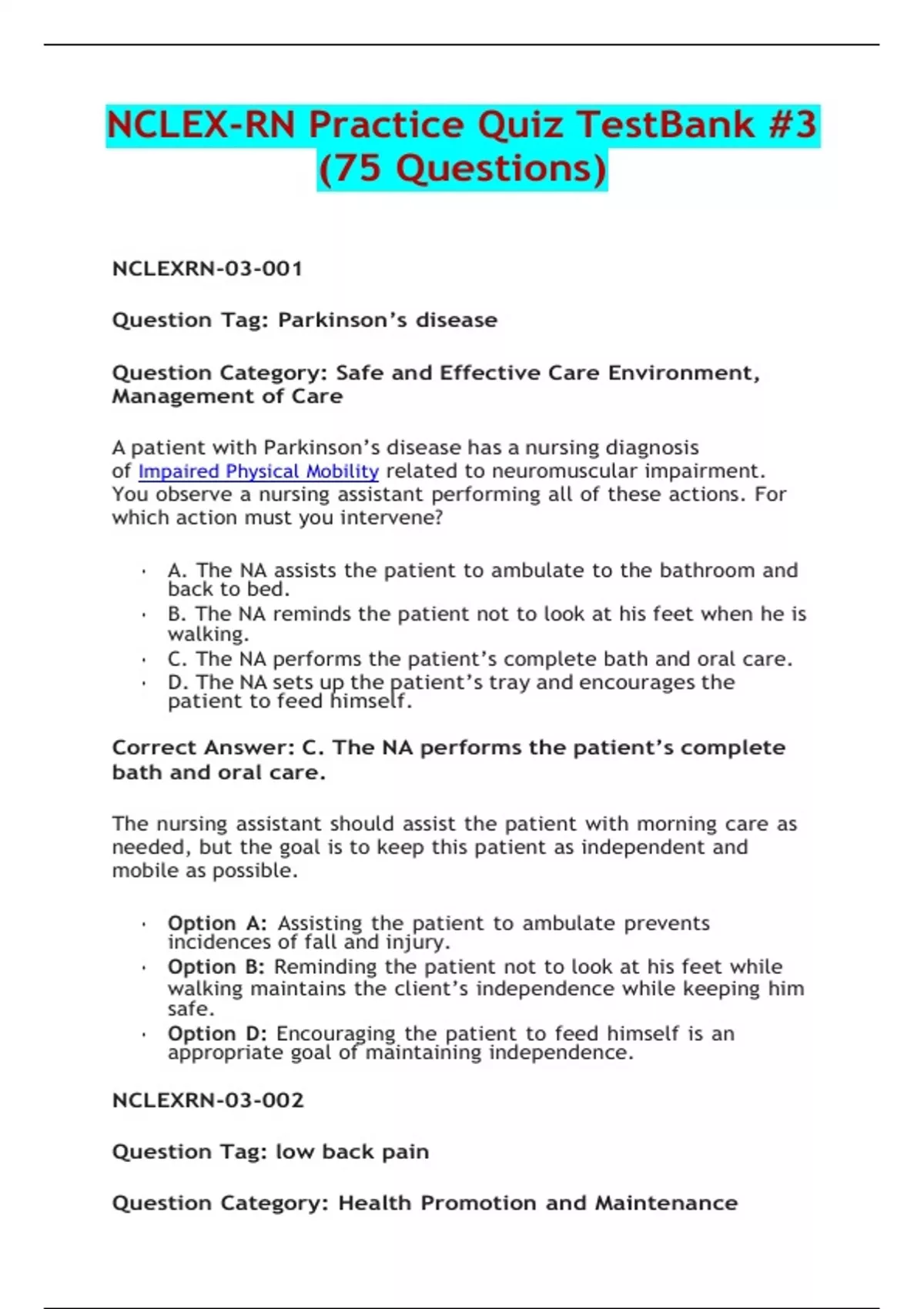 NCLEX-RN Practice Quiz Test Bank #3 (75 Questions) 1. 1. Question A patient with Parkinson’s disease has a nursing diagnosis of Impaired Physical Mobility related to neuromuscular impairment. You observe a nursing assistant performing all of these actions. For which action must you intervene? o A. The NA assists the patient to ambulate to the bathroom and back to bed. o B. The NA reminds the patient not to look at his feet when he is walking. o C. The NA performs the patient’s complete bath and oral care. o D. The NA sets up the patient’s tray and encourages the patient to feed himself. Incorrect Correct Answer: C. The NA performs the patient’s complete bath and oral care. The nursing assistant should assist the patient with morning care as needed, but the goal is to keep this patient as independent and mobile as possible. • Option A: Assisting the patient to ambulate prevents incidences of fall and injury. • Option B: Reminding the patient not to look at his feet while walking maintains the client’s independence while keeping him safe. • Option D: Encouraging the patient to feed himself is an appropriate goal of maintaining independence. 2. 2. Question The nurse is preparing to discharge a patient with chronic low back pain. Which statement by the patient indicates that additional teaching is necessary? • A. “I will avoid exercise because the pain gets worse.” • B. “I will use heat or ice to help control the pain.” • C. “I will not wear high-heeled shoes at home or work.” • D. “I will purchase a firm mattress to replace my old one.” Incorrect Correct Answer: A. “I will avoid exercise because the pain gets worse.” Exercises are used to strengthen the back, relieve pressure on compressed nerves and protect the back from re-injury. Doing exercises to strengthen the lower back can help alleviate and prevent lower back pain. It can also strengthen the core, leg, and arm muscles. According to researchers, exercise also increases blood flow to the lower back area, which may reduce stiffness and speed up the healing process. • Option B: Ice and heat application are appropriate interventions for back pain. Applying ice or a reusable gel pack constricts blood vessels and reduces swelling around the injury. This is particularly useful for conditions, like a sprained ankle, that cause significant swelling. Heat has the opposite effect, increasing blood flow to the area. This relaxes muscle fibers, which can help when the client experiences spasms or stiffness. • Option C: People with chronic back pain should avoid wearing high-heeled shoes at all times. The normal s-curve of the spine acts as a cushion or spring, reducing stress on the vertebrae. When wearing high heels, the shape of the spine is altered and the client doesn’t get that same shock absorption as she walks, which, over time, can lead to uneven wear on the cartilage discs, joints and ligaments of the back. • Option D: A firm mattress prevents lower back pain. Sleeping on a mattress that is too firm can cause aches and pains on pressure points. A medium-firm mattress may be more comfortable because it allows the shoulder and hips to sink in slightly. Patients who want a firmer mattress for back support can get one with thicker padding for greater comfort. 3. 3. Question A patient with a spinal cord injury (SCI) complains about a severe throbbing headache that suddenly started a short time ago. Assessment of the patient reveals increased blood pressure (168/94) and decreased heart rate (48/minute), diaphoresis, and flushing of the face and neck. What action should you take first? • A. Administer the ordered acetaminophen (Tylenol). • B. Check the Foley tubing for kinks or obstruction. • C. Adjust the temperature in the patient’s room. • D. Notify the physician about the change in status. Incorrect Correct Answer: B. Check the Foley tubing for kinks or obstruction. These signs and symptoms are characteristic of autonomic dysreflexia, a neurologic emergency that must be promptly treated to prevent a hypertensive stroke. The cause of this syndrome is noxious stimuli, most often a distended bladder or constipation, so checking for poor catheter drainage, bladder distention, or fecal impaction is the first action that should be taken. • Option C: Adjusting the room temperature may be helpful, since too cool a temperature in the room may contribute to the problem. • Option A: Tylenol will not decrease the autonomic dysreflexia that is causing the patient’s headache. • Option D: Notification of the physician may be necessary if nursing actions do not resolve symptoms. 4. 4. Question Which patient should you, as charge nurse, assign to a new graduate RN who is orienting to the neurologic unit? • A. A 28-year-old newly admitted patient with spinal cord injury. • B. A 67-year-old patient with stroke 3 days ago and left-sided weakness. • C. An 85-year-old dementia patient to be transferred to long-term care today. • D. A 54-year-old patient with Parkinson’s who needs assistance with bathing. Incorrect Correct Answer: B. A 67-year-old patient with stroke 3 days ago and left-sided weakness. The new graduate RN who is oriented to the unit should be assigned stable, non-complex patients, such as the patient with stroke. • Option A: The newly admitted SCI should be assigned to experienced nurses. Most cases of SCI take place when trauma breaks and squeezes the vertebrae, or the bones of the back. This, in turn, damages the axons—the long nerve cell “wires” that pass through vertebrae, carrying signals between the brain and the rest of the body. The axons might be crushed or completely severed by this damage. Someone with injury to only a few axons might be able to recover completely from their injury. On the other hand, a person with damage to all axons will most likely be paralyzed in the areas below the injury. • Option C: A patient for transfer should be assigne