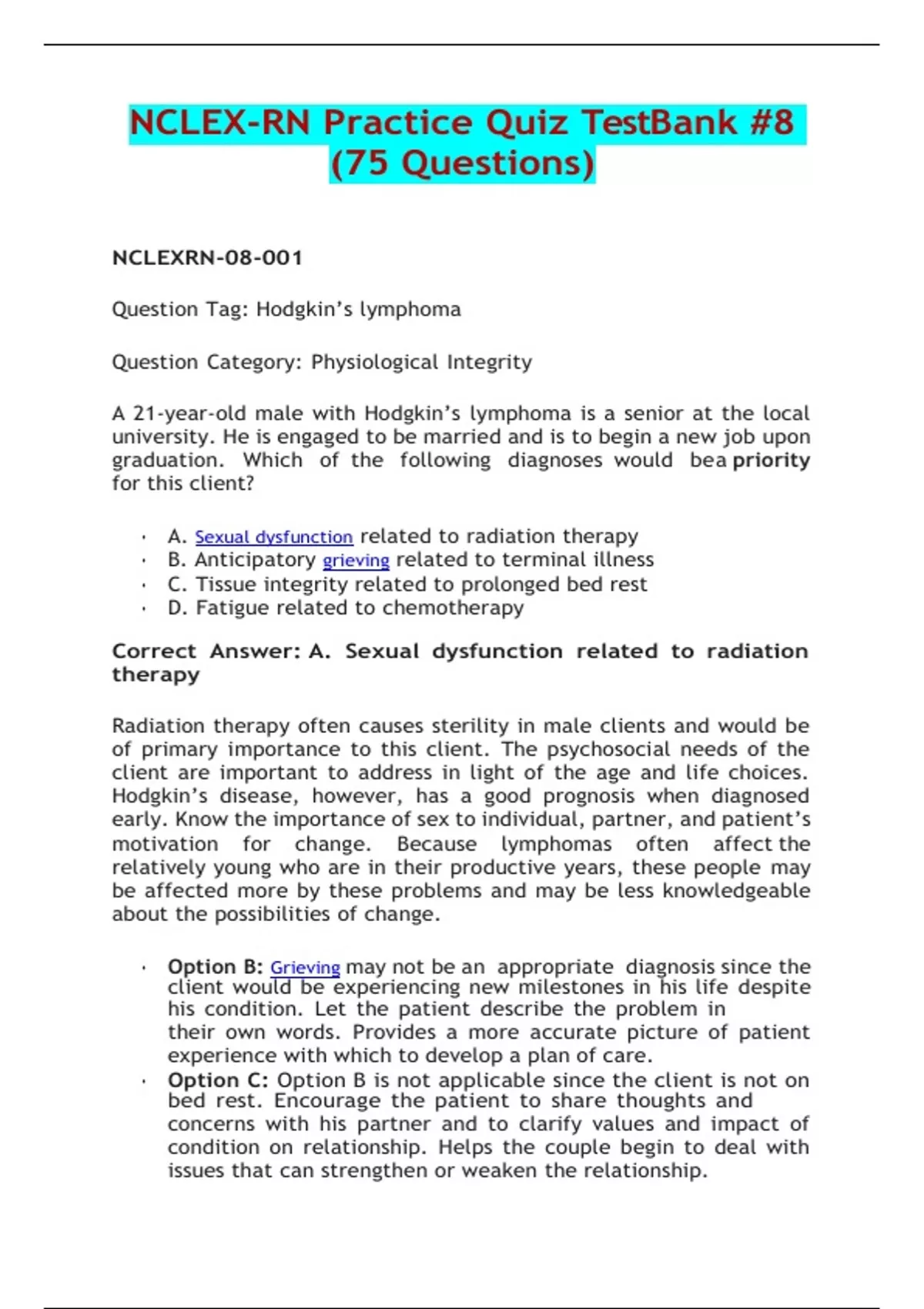 NCLEX-RN Practice Quiz Test Bank #8 (75 Questions) 1. 1. Question A 21-year-old male with Hodgkin’s lymphoma is a senior at the local university. He is engaged to be married and is to begin a new job upon graduation. Which of the following diagnoses would be a priority for this client? o A. Sexual dysfunction related to radiation therapy o B. Anticipatory grieving related to terminal illness o C. Tissue integrity related to prolonged bed rest o D. Fatigue related to chemotherapy Incorrect Correct Answer: A. Sexual dysfunction related to radiation therapy Radiation therapy often causes sterility in male clients and would be of primary importance to this client. The psychosocial needs of the client are important to address in light of the age and life choices. Hodgkin’s disease, however, has a good prognosis when diagnosed early. Know the importance of sex to individual, partner, and patient’s motivation for change. Because lymphomas often affect the relatively young who are in their productive years, these people may be affected more by these problems and may be less knowledgeable about the possibilities of change. • Option B: Grieving may not be an appropriate diagnosis since the client would be experiencing new milestones in his life despite his condition. Let the patient describe the problem in own words. Provides a more accurate picture of patient experience with which to develop a plan of care. • Option C: Option B is not applicable since the client is not on bed rest. Encourage the patient to share thoughts and concerns with his partner and to clarify values and impact of condition on relationship. Helps the couple begin to deal with issues that can strengthen or weaken the relationship. • Option D: Fatigue may occur during chemotherapy, but it is not the priority diagnosis. Identify pre-existing and current stress factors that may be affecting the relationship. The patient may be concerned about other issues, such as job, financial, and illness-related problems. 2. 2. Question A client has autoimmune thrombocytopenic purpura. To determine the client’s response to treatment, the nurse would monitor: • A. Platelet count • B. White blood cell count • C. Potassium levels • D. Partial prothrombin time (PTT) Incorrect Correct Answer: A. Platelet count Clients with autoimmune thrombocytopenic purpura (ATP) have low platelet counts, making answer A the correct answer. The laboratory tests will show low platelet count, usually 40×10^9/L for over three months. Blood film shows large platelets and tiny platelet fragments. Bone marrow examination shows an increased number of megakaryocytes. • Option B: Often associated with the CBC is a differential, which refers to the relative amounts of white blood cell types (i.e., neutrophil, lymphocyte, eosinophil, etc.) as a percentage of the total number of WBCs. Of note, if a subtype of white blood cells seems to be elevated based on the differential, the actual value of the type of white blood cells should be calculated by multiplying the percentage listed on the differential by the total number of white blood cells. • Option C: Potassium disorders are related to cardiac arrhythmias. Hypokalemia occurs when serum potassium levels under 3.6 mmol/L—weakness, fatigue, and muscle twitching present in hypokalemia. Hyperkalemia occurs when the serum potassium levels above 5.5 mmol/L, which can result in arrhythmias. Muscle cramps, muscle weakness, rhabdomyolysis, myoglobinuria are presenting signs and symptoms in hyperkalemia. • Option D: Patients with a propensity for bleeding should undergo testing to determine the presence of a clotting disorder. For patients with deficiencies or defects of the intrinsic clotting cascade, the PTT will be elevated. Normal PTT values can vary between laboratories but 25 to 35 seconds is considered normal. 3. 3. Question The home health nurse is visiting a client with autoimmune thrombocytopenic purpura (ATP). The client’s platelet count currently is 80, it will be most important to teach the client and family about: • A. Bleeding precautions • B. Prevention of falls • C. Oxygen therapy • D. Conservation of energy Incorrect Correct Answer: A. Bleeding precautions The normal platelet count is 120,000–400, Bleeding occurs in clients with low platelets. The priority is to prevent and minimize bleeding. Review laboratory results for coagulation status as appropriate: platelet count, prothrombin time/international normalized ratio (PT/INR), activated partial thromboplastin time (aPTT), fibrinogen, bleeding time, fibrin degradation products, vitamin K, activated coagulation time (ACT); and educate the at-risk patient and caregivers about precautionary measures to prevent tissue trauma or disruption of the normal clotting mechanisms. • Option B: Thoroughly conform patient to surroundings; put call light within reach and teach how to call for assistance; respond to call light immediately; avoid use of restraints; obtain a physician’s order if restraints are needed; and eliminate or drop all possible hazards in the room such as razors, medications, and matches. • Option C: Option C is important, but platelets do not carry oxygen. Wash hands and teach patient and SO to wash hands before contact with patients and between procedures with the patient; encourage fluid intake of 2,000 to 3,000 mL of water per day, unless contraindicated. • Option D: Option D is of lesser priority and is incorrect in this instance. Recommend the use of soft-bristled toothbrushes and stool softeners to protect mucous membranes; and if infection occurs, teach the patient to take antibiotics as prescribed; instruct the patient to take the full course of antibiotics even if symptoms improve or disappear. 4. 4. Question A client with a pituitary tumor has had transsphenoidal hypophysectomy. Which of the following interventions would be appropriate for this client? • A. Place the client in Trendelenburg posit