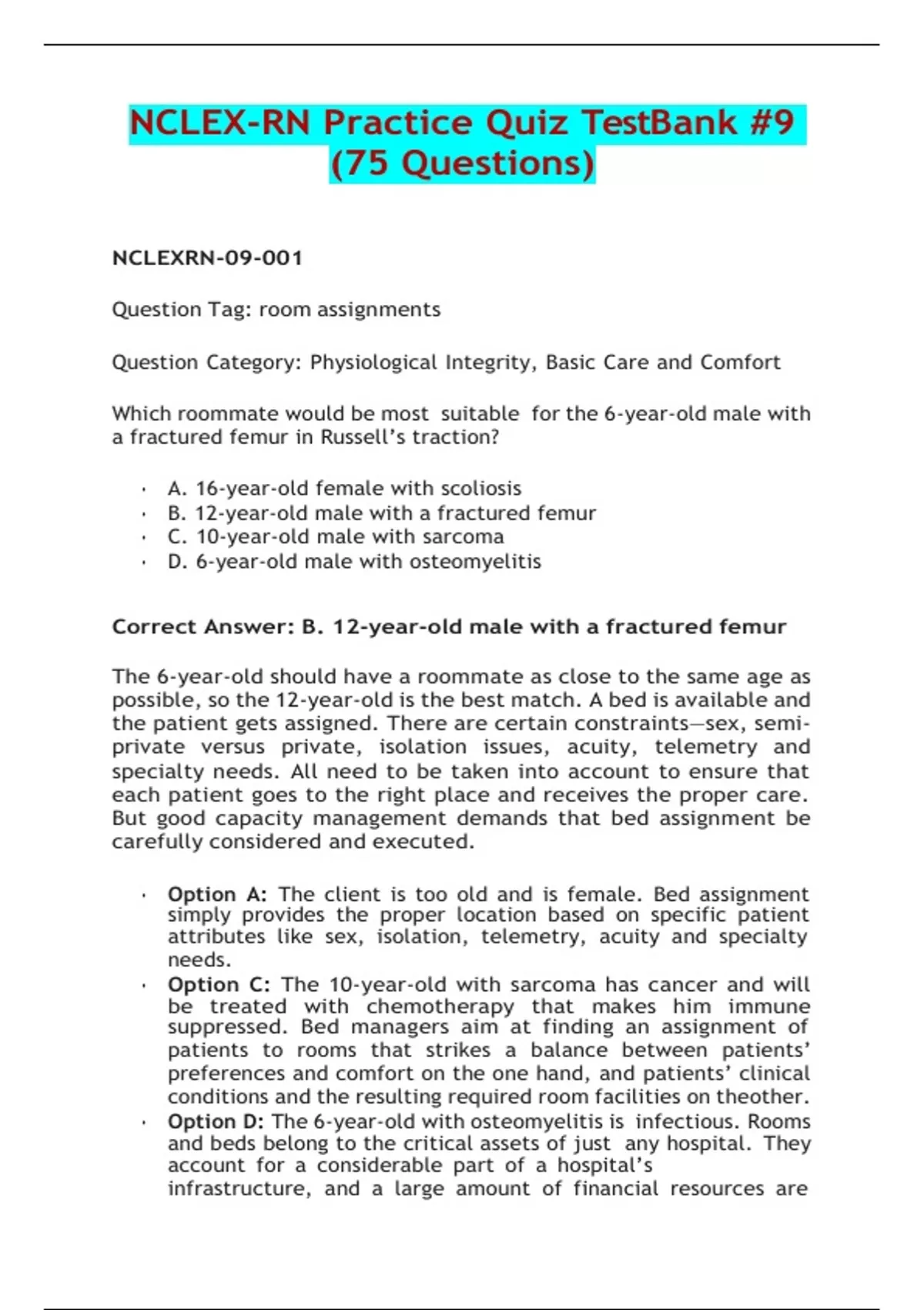 NCLEX-RN Practice Quiz Test Bank #9 (75 Questions) 1. 1. Question Which roommate would be most suitable for the 6-year-old male with a fractured femur in Russell’s traction? o A. 16-year-old female with scoliosis o B. 12-year-old male with a fractured femur o C. 10-year-old male with sarcoma o D. 6-year-old male with osteomyelitis Incorrect Correct Answer: B. 12-year-old male with a fractured femur The 6-year-old should have a roommate as close to the same age as possible, so the 12-year-old is the best match. A bed is available and the patient gets assigned. There are certain constraints—sex, semi-private versus private, isolation issues, acuity, telemetry and specialty needs. All need to be taken into account to ensure that each patient goes to the right place and receives the proper care. But good capacity management demands that bed assignment be carefully considered and executed. • Option A: The client is too old and is female. Bed assignment simply provides the proper location based on specific patient attributes like sex, isolation, telemetry, acuity, and specialty needs. • Option C: The 10-year-old with sarcoma has cancer and will be treated with chemotherapy that makes him immune suppressed. Bed managers aim at finding an assignment of patients to rooms that strikes a balance between patients’ preferences and comfort on the one hand, and patients’ clinical conditions and the resulting required room facilities on the other. • Option D: The 6-year-old with osteomyelitis is infectious. Rooms and beds belong to the critical assets of just any hospital. They account for a considerable part of a hospital’s infrastructure, and a large amount of financial resources are invested in equipping them with medical apparatus to facilitate patient care. Furthermore, they also represent the place where most patients will spend a large part of their stay, as they recover from surgery, wait for examinations to take place, etc. 2. 2. Question A client with osteoarthritis has a prescription for celebrex (Celecoxib). Which instruction should be included in the discharge teaching? • A. Take the medication with milk. • B. Report chest pain. • C. Remain upright after taking for 30 minutes. • D. Allow 6 weeks for optimal effects. Incorrect Correct Answer: B. Report chest pain. Cox II inhibitors have been associated with heart attacks and strokes. Any changes in cardiac status or signs of a stroke should be reported immediately, along with any changes in bowel or bladder habits because bleeding has been linked to use of Cox II inhibitors. Like all NSAIDs, celecoxib carries an FDA boxed warning for cardiovascular risk, including the increased risk of heart attacks and strokes. As a selective COX-2 inhibitor, celecoxib also faces scrutiny for increased cardiovascular risk, since another selective COX-2 inhibitor, rofecoxib, was withdrawn from production in 2004 due to cardiovascular risk concerns. • Options A: The medication can be taken with water. Celecoxib is a medication that is taken orally and comes in 50, 100, 200, and 400 mg doses. In rare cases, celecoxib can also be added to customized compounds for topical administration with or without the use of iontophoresis or other topical delivery mechanisms. It is not available via any other route of administration. • Option C: The client may remain upright but not necessarily for 30 minutes. Symptoms of celecoxib overdose would likely be similar to overdoses of other NSAIDs, which include lethargy, drowsiness, nausea, vomiting, and epigastric pain. Activated charcoal may be administered for overdose treatment at the discretion of emergency medical providers if the patient presents within 4 hours of known or suspected ingestion of significant amounts of celecoxib. • Option D: Allow 6 weeks for optimal effect. In the inpatient setting, as mentioned above, celecoxib is increasingly being used as part of pre-operative and post-operative multimodal pain management algorithms. Research has shown in several small randomized trials that administering celecoxib peri-operatively for elective procedures such as total hip arthroplasties, total knee arthroplasties, and other procedures with some success in reducing pain and improving functionality such as early ambulation. 3. 3. Question A client with a fractured tibia has a plaster-of-Paris cast applied to immobilize the fracture. Which action by the nurse indicates an understanding of a plaster-of-Paris cast? The nurse: • A. Handles the cast with the fingertips • B. Petals the cast • C. Dries the cast with a hair dryer • D. Allows 24 hours before bearing weight Incorrect Correct Answer: D. Allows