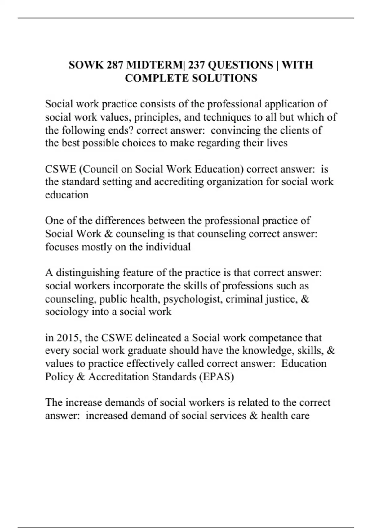 Social work practice consists of the professional application of social work values, principles, and techniques to all but which of the following ends? correct answer: convincing the clients of the best possible choices to make regarding their lives CSWE (Council on Social Work Education) correct answer: is the standard setting and accrediting organization for social work education One of the differences between the professional practice of Social Work & counseling is that counseling correct answer: focuses mostly on the individual A distinguishing feature of the practice is that correct answer: social workers incorporate the skills of professions such as counseling, public health, psychologist, criminal justice, & sociology into a social work in 2015, the CSWE delineated a Social work competance that every social work graduate should have the knowledge, skills, & values to practice effectively called correct answer: Education Policy & Accreditation Standards (EPAS) The increase demands of social workers is related to the correct answer: increased demand of social services & health care (T /F) Discriminatory behavior & personal slights against LGBTQ people have all but disappeared in the US c
