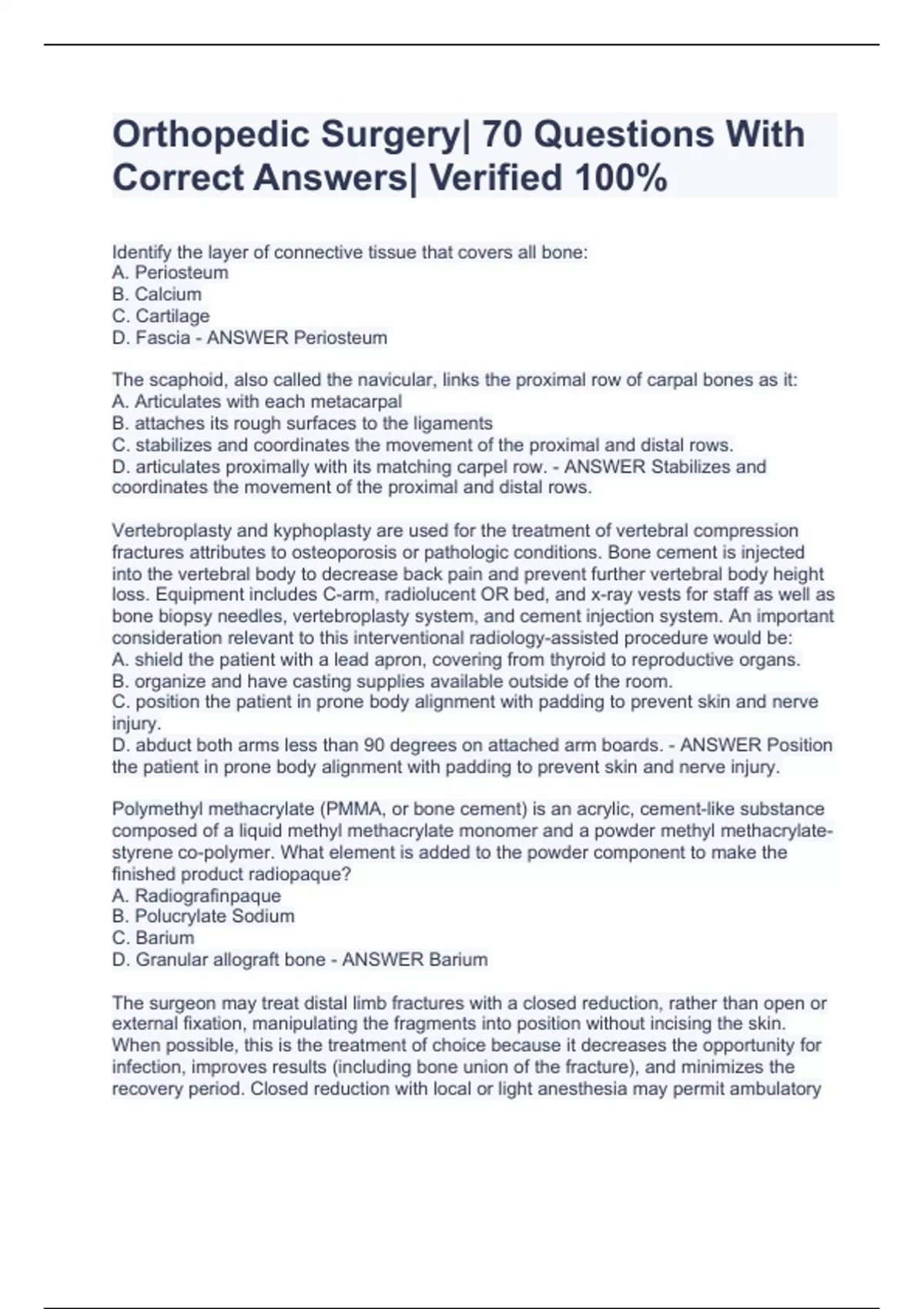 Identify the layer of connective tissue that covers all bone: A. Periosteum B. Calcium C. Cartilage D. Fascia - ANSWER Periosteum The scaphoid, also called the navicular, links the proximal row of carpal bones as it: A. Articulates with each metacarpal B. attaches its rough surfaces to the ligaments C. stabilizes and coordinates the movement of the proximal and distal rows. D. articulates proximally with its matching carpel row. - ANSWER Stabilizes and coordinates the movement of the proximal and distal rows. Vertebroplasty and kyphoplasty are used for the treatment of vertebral compression fractures attributes to osteoporosis or pathologic conditions. Bone cement is injected into the vertebral body to decrease back pain and prevent further vertebral body height loss. Equipment includes C-arm, radiolucent OR bed, and x-ray vests for staff as well as bone biopsy needles, vertebroplasty system, and cement injection system. An important consideration relevant to this interventional radiology-assisted procedure would be: A. shield the patient with a lead apron, covering from thyroid to reproductive organs. B. organize and have casting supplies available outside of the room. C. position the patient in prone body alignment with padding to prevent skin and nerve injury. D. abduct both arms less than 90 degrees on attached arm boards. - ANSWER Position the patient in prone body alignment with padding to prevent skin and nerve injury. Polymethyl methacrylate (PMMA, or bone cement) is an acrylic, cement-like substance composed of a liquid methyl methacrylate monomer and a powder methyl methacrylate-styrene co-polymer. What element is added to the powder component to make the finished product radiopaque? A. Radiografinpaque B. Polucrylate Sodium C. Barium D. Granular allograft bone - ANSWER Barium The surgeon may treat distal limb fractures with a closed reduction, rather than open or external fixation, manipulating the fragments into position without incising the skin. When possible, this is the treatment of choice because it decreases the opportunity for infection, improves results (including bone union of the fracture), and minimizes the recovery period. Closed reduction with local or light anesthesia may permit ambulatory surgery. Select a situation where closed reduction would be performed in addition to open reduction and fixation surgery to a distal limb. A. Significant bone comminution B. Where periosteal damage is evident C. Before an open procedure to reduce the fracture site. D. When soft tissue entrapment is suspected. - ANSWER When soft tissue entrapment is suspected Osteomalacia is a metabolic bone disease characterized by inadequate mineralization of bone, which leads to reduced absorption of calcium and phosphorus. This malabsorption condition is due to a deficiency of _____ that can be treated by _______. A. calcium; nutritional diet and supplements. B. vitamin D; dietary supplements and exposure to sunlight C. phosphorus; nutraceuticals and exposure to therapeutic radiation D. soy protein; weight-bearing exercise and sunlight - ANSWER Vitamin D; dietary supplements and exposure to sunlight Open reduction and internal fixation (ORIF) is a method of providing exposure of the fracture site and using pins, wire screws, a plate and screw combination, rods, or nails to correct the fracture. Surgeons use open reduction and internal fixation when they are unable to reduce a fracture by closed methods and skeletal traction is not indicated. What would be an advantage for an open rather than closed fracture reduction technique? A. Direct observation and verification of fracture alignment B. Decreased opportunity for surgical site infection C. Improved bone union outcomes D. Ability to rule out comminuted or compound fractures without imaging. - ANSWER Direct observation and verification of fracture alignment Paget's disease is a disorder affecting older adults. The bones are weak and poorly constructed. It is characterized by the proliferation of osteoclasts and compensatory increased osteoblastic activity. This degenerative process results in: A. weak and non-supported bone matrix. B. replacement of cancellous bone with cortical bone. C. rapid, disorganized bone remodeling. D. immature bone cells with air spaces. - ANSWER Rapid, disorganized bone remodeling Osteoporosis is one of the most common and serious bone diseases and is responsible for more than 2 million fractures a year. Osteoporosis -related fractures most commonly occur in the hip, spine, and wrist, but any bone can be affected. The excessive reduction of total bone mass in osteoporosis is due to the loss of: A. calcified matrix and collagenous fibers. B. exercise and weight-bearing physical activity. C. estrogen and testosterone D. calcium and Vitamin D. - ANSWER Calcified matrix and collagenous fibers The vertebral bodies are connected by several cartilaginous joints. What purpose does this connection enable? A. Communication between the spinous process and vertebral bodies B. Vertebral flexion, rotation, and extension C. Vertebral flexion and torsion D. Sustains integrity and spinal support. - ANSWER Vertebral flexion and torsion Colles' (wrist) fracture is a dorsally angulated fracture of the distal end of the radius. Most of these fractures can be managed successfully with closed reduction and immobilization, but external fixation is especially useful in the case of comminuted intra-articular fracture. Internal fixation with Kirschner wires (K wires) is indicated when the distal end of the radius is severely comminuted and displaced. Select the correct statement for a patient with Colles' fracture fixation. A. Position in modified semi-fowler with the hand table and tourniquet at the operative side. B. Provide soft tissue instruments in OR and casting supplies available outside OR. C. Place and tourniquet cuff at mid forearm level and set to systolic blood pressure level. D. Position affected wrist and take an AP lateral f