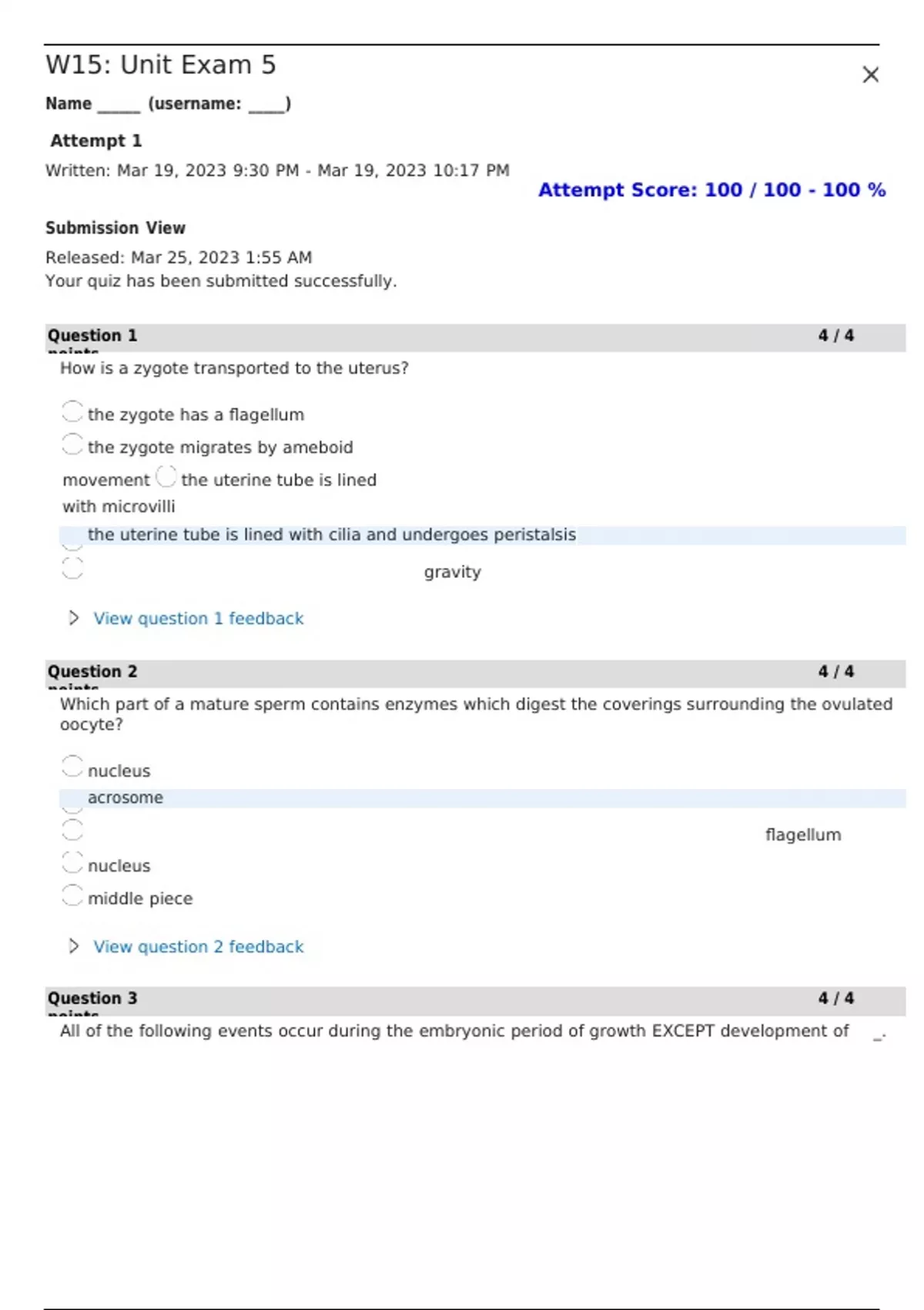 1. Question: How is a zygote transported to the uterus? 2. Question: Which part of a mature sperm contains enzymes which digest the coverings surrounding the ovulated oocyte? 3. Question: All of the following events occur during the embryonic period of growth EXCEPT development of ________ _. 4. Question: "False labor" or Braxton Hicks contractions are weak, irregular contractions of the myometrium triggered by 5. Question: Which hormone is responsible for mammary gland development at puberty? 6. Question: The inner cell mass of the trophoblast developments into the primary germ layers which are named the ______ , _______, and _______ _. 7. Question: The first stage of labor is marked by dilation of the uterine ______ _. 8. Question: The usual site of embryo implantation and growth is the __________. 9. Question: n the months preceding birth, the hormone which causes pelvic ligaments to become more flexible to enable widening of the pelvis during delivery is________ 10. Question: The placenta is formed by endometrial tissue of the uterine lining and the ______ _. 11. Question: n men during sexual arousal, penile erections occur due to Nitric Oxide being released from what structures? 12. Question: Which hypothalamic hormone contributes to the regulation of the male reproductive system? 13. Question: What is the purpose of Sertoli cells? 14. Question: What is the function of the epididymis? 15. In addition to testosterone being released into intratesticular secretion, it is also released into systemic circulation for the role of all but which one of the following? 16. Question: In the testes, sperm cells replicate and differentiate in the_______ _. 17. Question: In the testes, sperm cells replicate and differentiate in the_______ _. 18. Question: All of the following statements concerning oogenesis are correct EXCEPT: 19. Question: Without SRY expression, an embryo will develop: 20. Question: If the average length of a woman's ovarian cycle is 30 days, the average length of her uterine cycles is most likely ____ days. 21. Question: What are the female gonads called? 22. Question: After ovulation, the secondary oocyte is drawn from the peritoneal cavity into the uterine tube by_________.