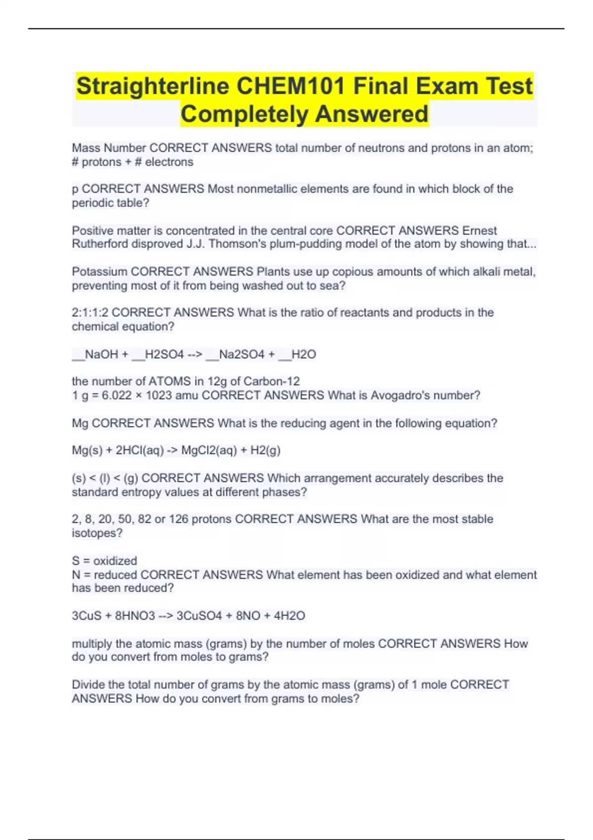 Straighterline CHEM101 Final Exam Test Completely Answered