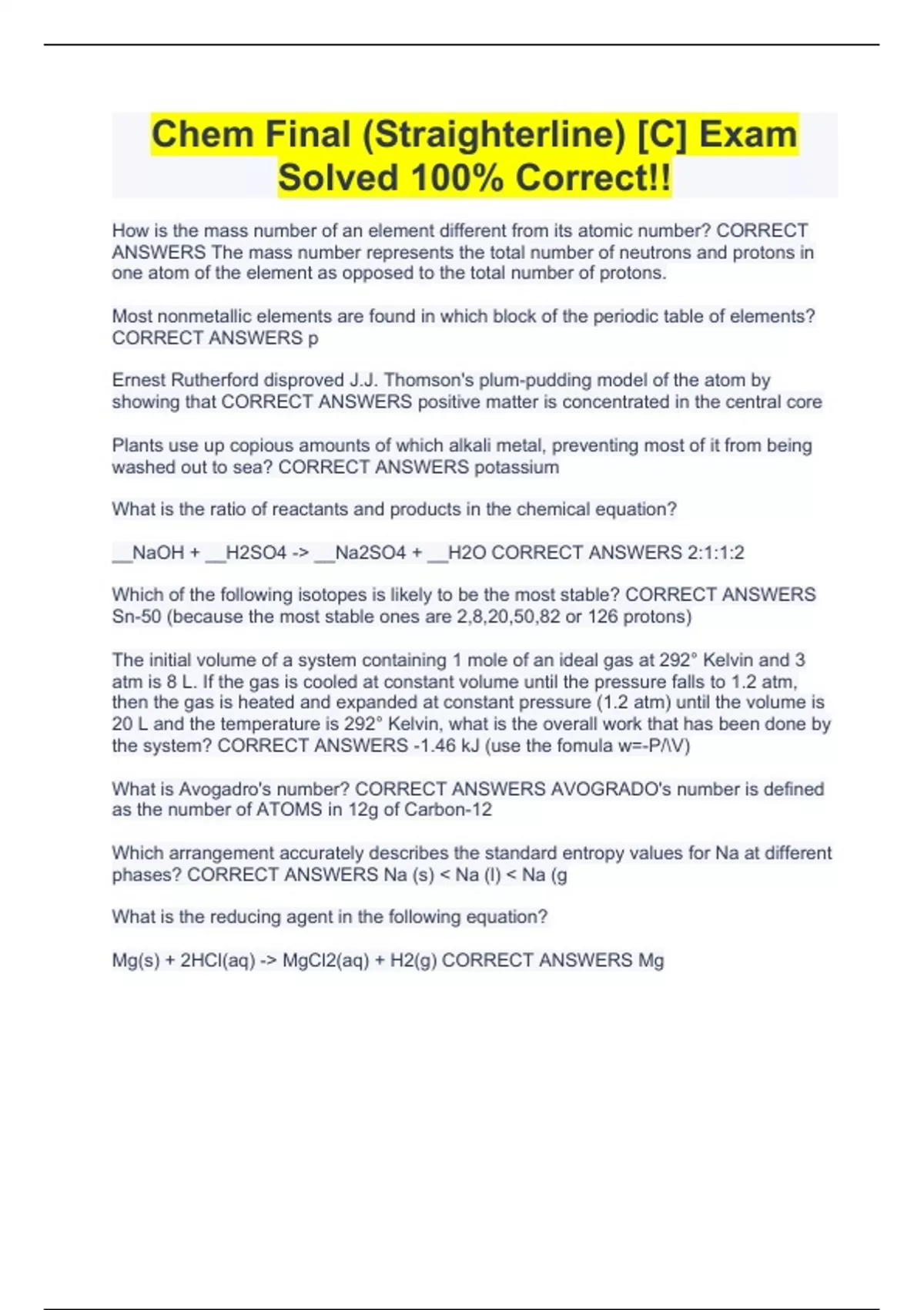 chem final straighterline c exam solved 100 c