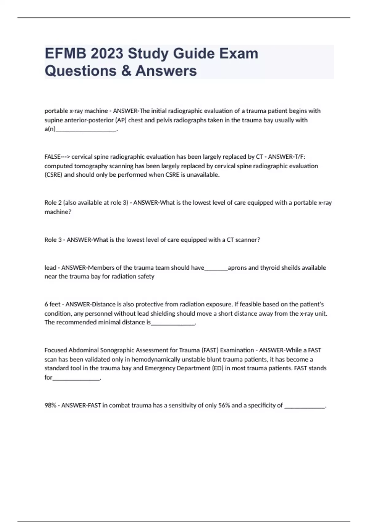 EFMB 2023 Study Guide Exam Questions & Answers portable x-ray machine - ANSWER-The initial radiographic evaluation of a trauma patient begins with supine anterior-posterior (AP) chest and pelvis radiographs taken in the trauma bay usually with a(n)__________________. FALSE---> cervical spine radiographic evaluation has been largely replaced by CT - ANSWER-T/F: computed tomography scanning has been largely replaced by cervical spine radiographic evaluation (CSRE) and should only be performed when CSRE is unavailable. Role 2 (also available at role 3) - ANSWER-What is the lowest level of care equipped with a portable x-ray machine? Role 3 - ANSWER-What is the lowest level of care equipped with a CT scanner? lead - ANSWER-Members of the trauma team should have_______aprons and thyroid sheilds available near the trauma bay for radiation safety 6 feet - ANSWER-Distance is also protective from radiation exposure. If feasible based on the patient's condition, any personnel without lead shielding should move a short distance away from the x-ray unit. The recommended minimal distance is_____________. Focused Abdominal Sonographic Assessment for Trauma (FAST) Examination - ANSWER-While a FAST scan has been validated only in hemodynamically unstable blunt trauma patients, it has become a standard tool in the trauma bay and Emergency Department (ED) in most trauma patients. FAST stands for______________. 98% - ANSWER-FAST in combat trauma has a sensitivity of only 56% and a specificity of ____________.