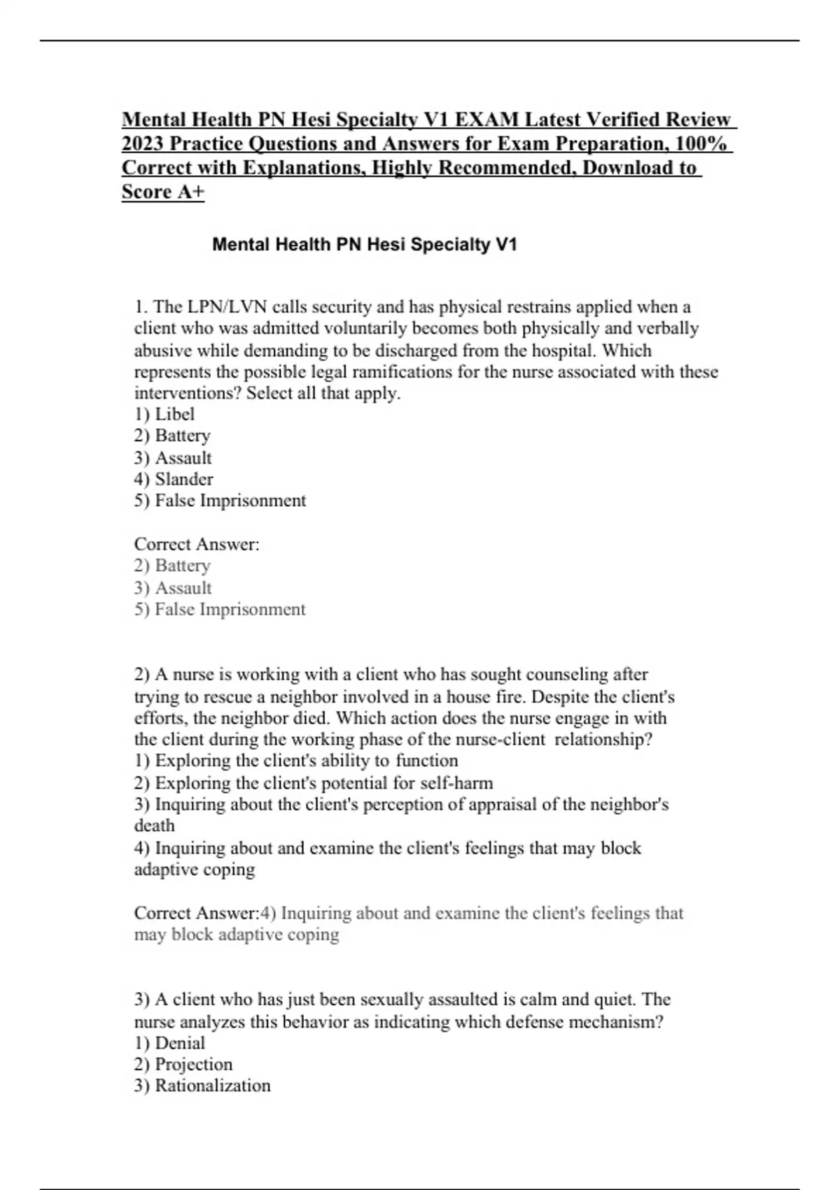 Mental Health PN Hesi Specialty V1 EXAM Latest Verified Review 2023 Practice Questions and Answers for Exam Preparation, 100% Correct with Explanations, Highly Recommended, Download to Score A+ Mental Health PN Hesi Specialty V1 1. The LPN/LVN calls security and has physical restrains applied when a client who was admitted voluntarily becomes both physically and verbally abusive while demanding to be discharged from the hospital. Which represents the possible legal ramifications for the nurse associated with these interventions? Select all that apply. 1) Libel 2) Battery 3) Assault 4) Slander 5) False Imprisonment Correct Answer: 2) Battery 3) Assault 5) False Imprisonment 2) A nurse is working with a client who has sought counseling after trying to rescue a neighbor involved in a house fire. Despite the client's efforts, the neighbor died. Which action does the nurse engage in with the client during the working phase of the nurse-client relationship? 1) Exploring the client's ability to function 2) Exploring the client's potential for self-harm 3) Inquiring about the client's perception of appraisal of the neighbor's death 4) Inquiring about and examine the client's feelings that may block adaptive coping Correct Answer:4) Inquiring about and examine the client's feelings that may block adaptive coping 3) A client who has just been sexually assaulted is calm and quiet. The nurse analyzes this behavior as indicating which defense mechanism? 1) Denial 2) Projection 3) Rationalization 4) Intellectualization
