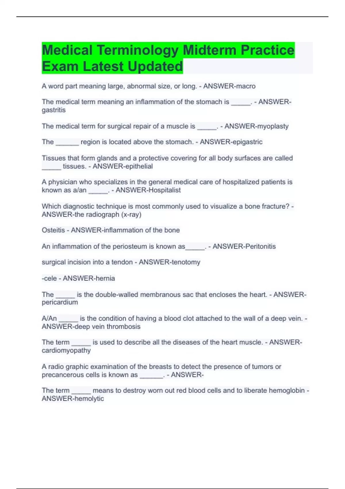 A word part meaning large, abnormal size, or long. - ANSWER-macro The medical term meaning an inflammation of the stomach is _____. - ANSWER-gastritis The medical term for surgical repair of a muscle is _____. - ANSWER-myoplasty The ______ region is located above the stomach. - ANSWER-epigastric Tissues that form glands and a protective covering for all body surfaces are called _____ tissues. - ANSWER-epithelial A physician who specializes in the general medical care of hospitalized patients is known as a/an _____. - ANSWER-Hospitalist Which diagnostic technique is most commonly used to visualize a bone fracture? - ANSWER-the radiograph (x-ray) Osteitis - ANSWER-inflammation of the bone An inflammation of the periosteum is known as_____. - ANSWER-Peritonitis surgical incision into a tendon - ANSWER-tenotomy -cele - ANSWER-hernia The _____ is the double-walled membranous sac that encloses the heart. - ANSWER-pericardium A/An _____ is the condition of having a blood clot attached to the wall of a deep vein. - ANSWER-deep vein thrombosis The term _____ is used to describe all the diseases of the heart muscle. - ANSWER-cardiomyopathy A radio graphic examination of the breasts to detect the presence of tumors or precancerous cells is known as ______. - ANSWER- The term _____ means to destroy worn out red blood cells and to liberate hemoglobin - ANSWER-hemolytic