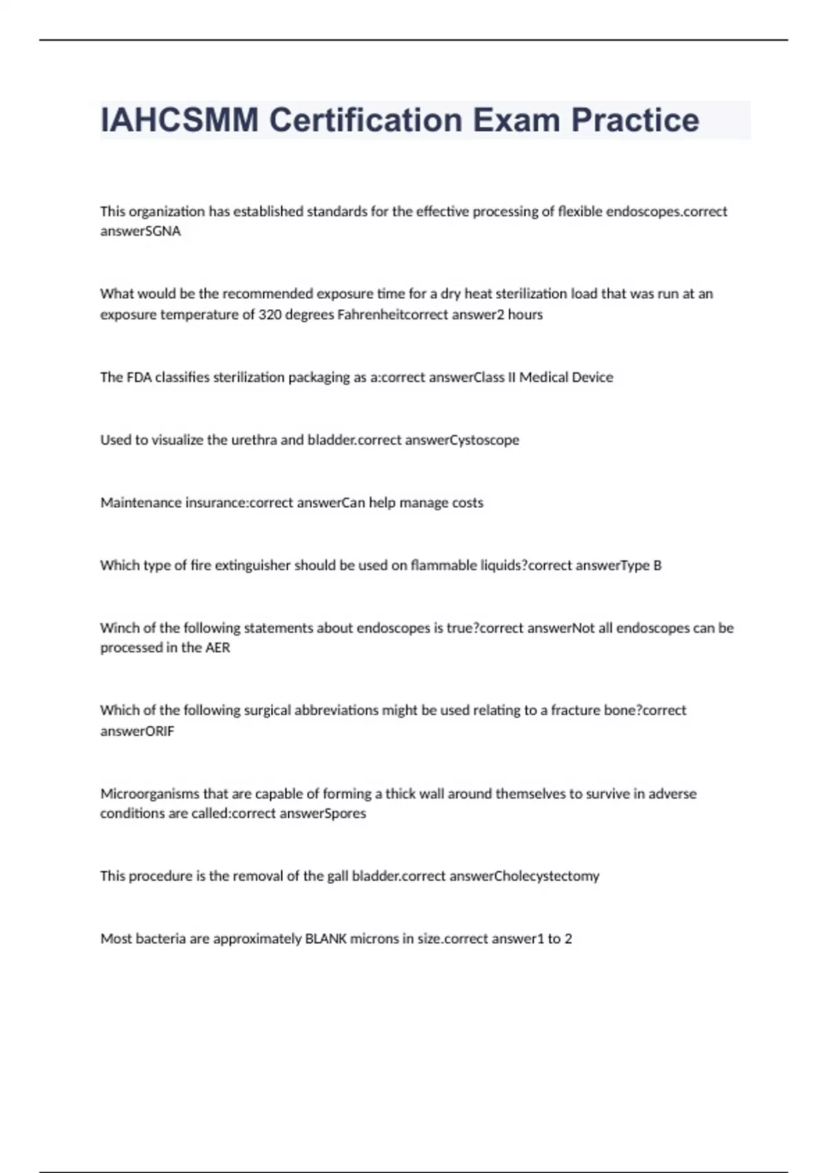 This organization has established standards for the effective processing of flexible endoscopes. SGNA What would be the recommended exposure time for a dry heat sterilization load that was run at an exposure temperature of 320 degrees Fahrenheit 2 hours The FDA classifies sterilization packaging as a: Class II Medical Device Used to visualize the urethra and bladder. Cystoscope Maintenance insurance: Can help manage costs Which type of fire extinguisher should be used on flammable liquids? Type B Winch of the following statements about endoscopes is true? Not all endoscopes can be processed in the AER Which of the following surgical abbreviations might be used relating to a fracture bone? ORIF