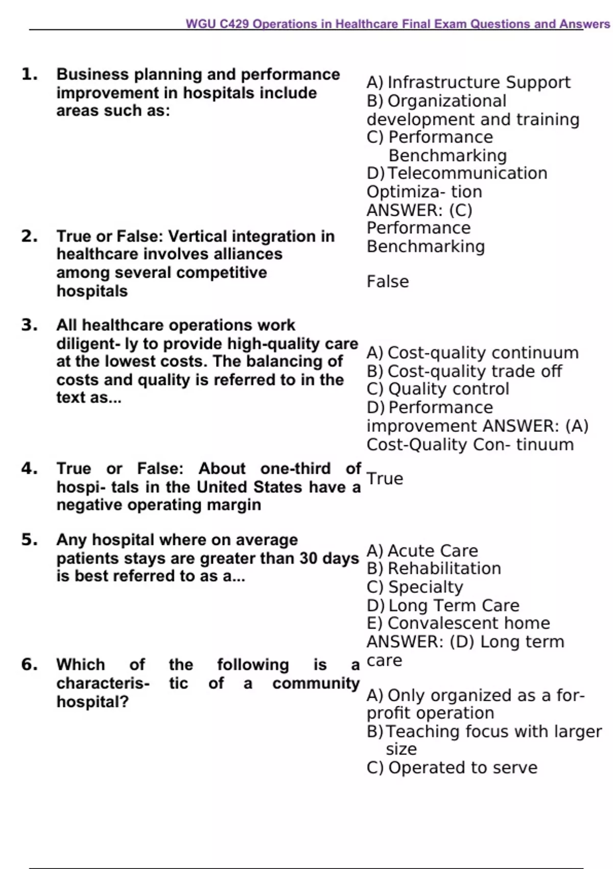 WGU C429 Operations in Healthcare Final Exam Questions and Answers Business planning and performance improvement in hospitals include areas such as