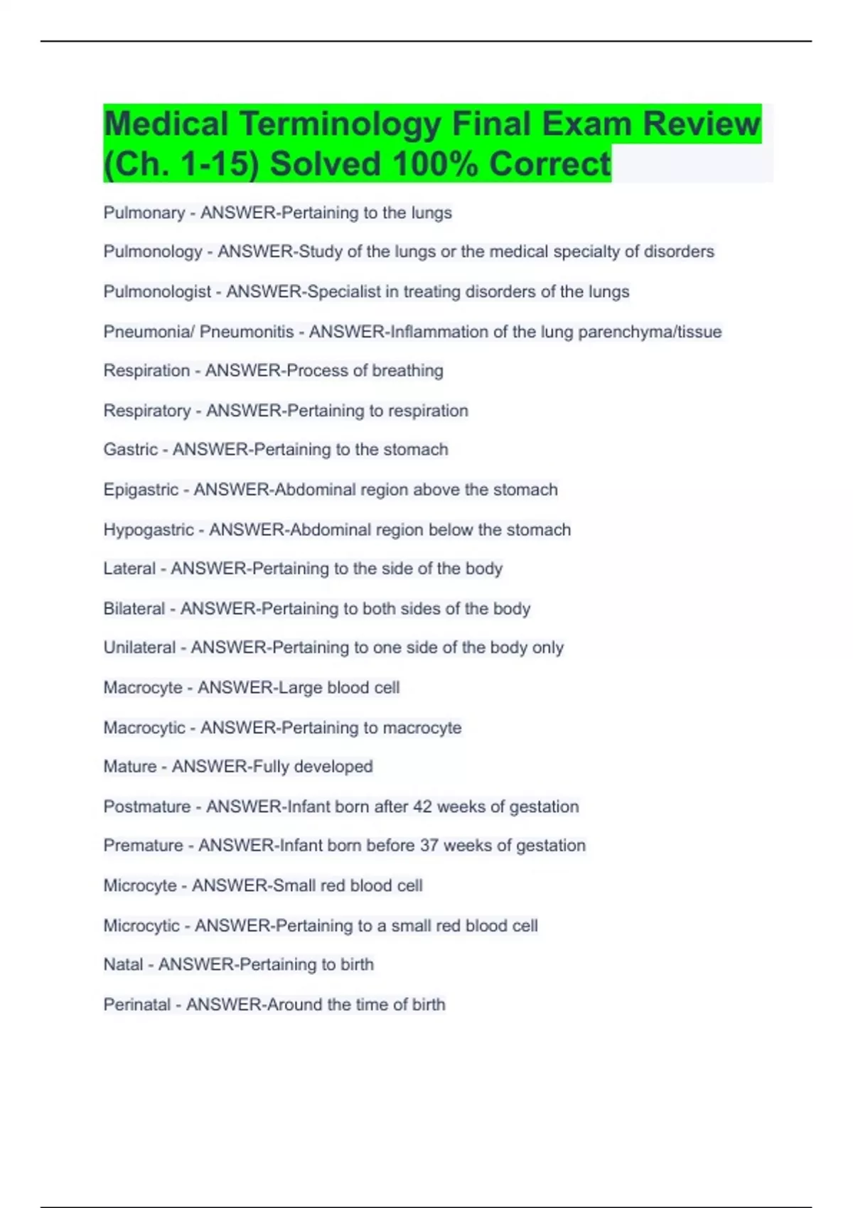 Pulmonary - ANSWER-Pertaining to the lungs Pulmonology - ANSWER-Study of the lungs or the medical specialty of disorders Pulmonologist - ANSWER-Specialist in treating disorders of the lungs Pneumonia/ Pneumonitis - ANSWER-Inflammation of the lung parenchyma/tissue Respiration - ANSWER-Process of breathing Respiratory - ANSWER-Pertaining to respiration Gastric - ANSWER-Pertaining to the stomach Epigastric - ANSWER-Abdominal region above the stomach Hypogastric - ANSWER-Abdominal region below the stomach Lateral - ANSWER-Pertaining to the side of the body Bilateral - ANSWER-Pertaining to both sides of the body Unilateral - ANSWER-Pertaining to one side of the body only Macrocyte - ANSWER-Large blood cell Macrocytic - ANSWER-Pertaining to macrocyte Mature - ANSWER-Fully developed Postmature - ANSWER-Infant born after 42 weeks of gestation Premature - ANSWER-Infant born before 37 weeks of gestation Microcyte - ANSWER-Small red blood cell Microcytic - ANSWER-Pertaining to a small red blood cell Natal - ANSWER-Pertaining to birth Perinatal - ANSWER-Around the time of birth