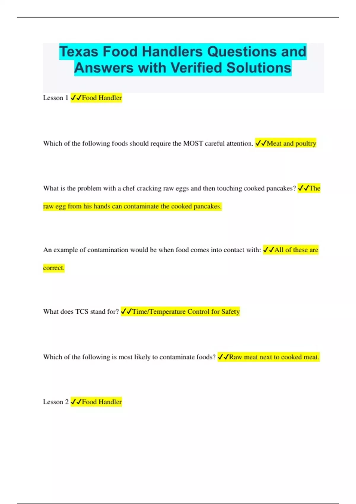 Texas Food Handlers Questions and Answers with Verified Solutions Lesson 1 Food Handler Which of the following foods should require the MOST careful attention? Meat and poultry What is the problem with a chef cracking raw eggs and then touching cooked pancakes? The raw egg from his hands can contaminate the cooked pancakes. An example of contamination would be when food comes into contact with All of these are correct. What does TCS stand for? Time/Temperature Control for Safety Which of the following is most likely to contaminate foods? Raw meat next to cooked meat. Lesson 2 Food Handler Which of the following is true? You must always wash your hands before putting on disposable gloves and after removing them. Where should you wash your hands before preparing food? At a handwashing sink that has warm water, soap, and paper towels. Which of the following times should you wash your hands twice? After using the restroom, and again before handling food. What should you do before putting on kitchen gloves? Wash your hands. Working on the cook line can be busy. You should be sure to: Wash your hands and use utensils to keep from touching raw foods. What is a good practice while working in food service? Wearing your fingernails short. Drinking is permitted... In the work area, use a non-breakable container with a handle, lid, and straw (if permitted by your employer/health department). Lesson 3 Food Handle