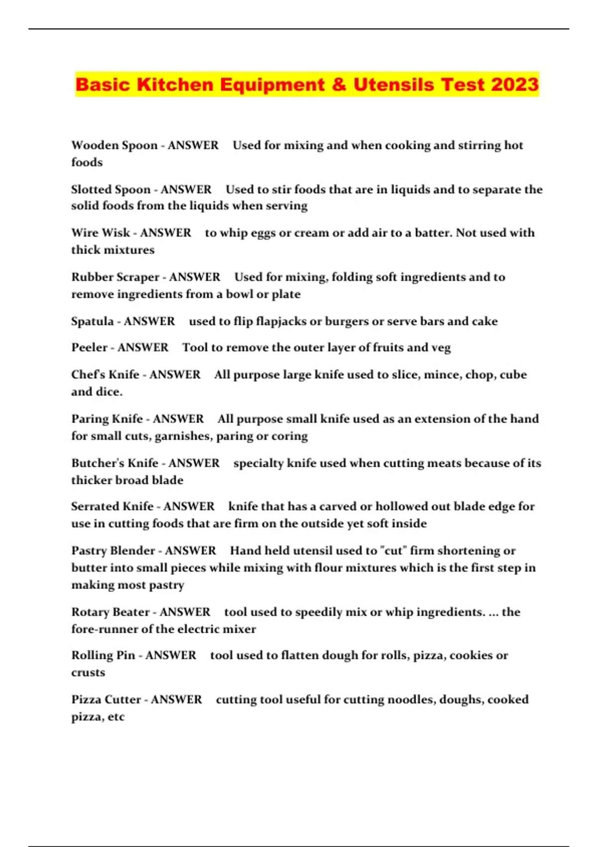 Basic Kitchen Equipment & Utensils Test 2023...