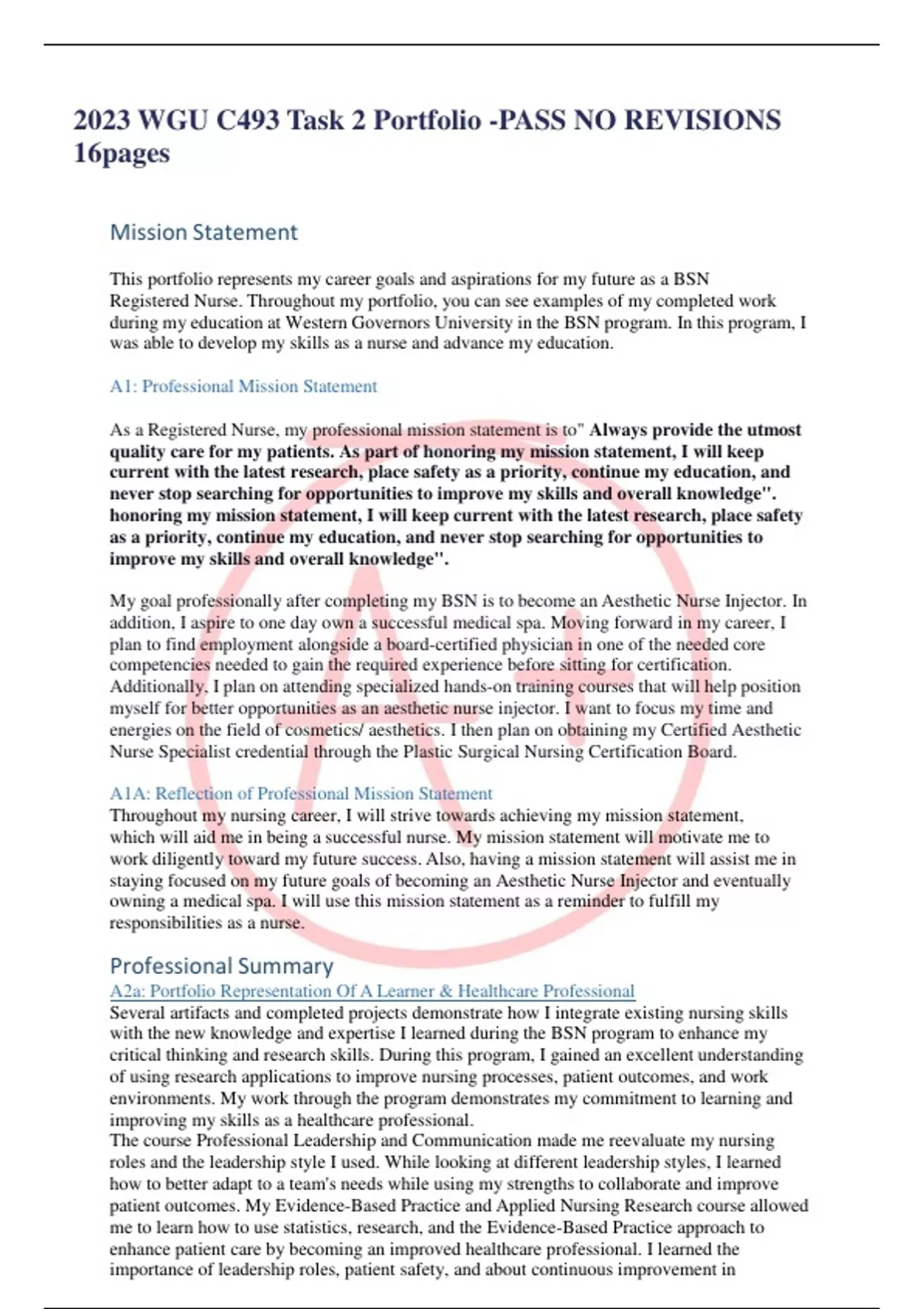 2023 WGU C493 Task 2 Portfolio -PASS NO REVISIONS 16pages Mission Statement This portfolio represents my career goals and aspirations for my future as a BSN Registered Nurse. Throughout my portfolio, you can see examples of my completed work during my education at Western Governors University in the BSN program. In this program, I was able to develop my skills as a nurse and advance my education. A1: Professional Mission Statement As a Registered Nurse, my professional mission statement is to" Always provide the utmost quality care for my patients. As part of honoring my mission statement, I will keep current with the latest research, place safety as a priority, continue my education, and never stop searching for opportunities to improve my skills and overall knowledge". honoring my mission statement, I will keep current with the latest research, place safety as a priority, continue my education, and never stop searching for opportunities to improve my skills and overall knowledge". My goal professionally after completing my BSN is to become an Aesthetic Nurse Injector. In addition, I aspire to one day own a successful medical spa. Moving forward in my career, I plan to find employment alongside a board-certified physician in one of the needed core competencies needed to gain the required experience before sitting for certification. Additionally, I plan on attending specialized hands-on training courses that will help position myself for better opportunities as an aesthetic nurse injector. I want to focus my time and energies on the field of cosmetics/ aesthetics. I then plan on obtaining my Certified Aesthetic Nurse Specialist credential through the Plastic Surgical Nursing Certification Board. A1A: Reflection of Professional Mission Statement Throughout my nursing career, I will strive towards achieving my mission statement, which will aid me in being a successful nurse. My mission statement will motivate me to work diligently toward my future success. Also, having a mission statement will assist me in staying focused on my future goals of becoming an Aesthetic Nurse Injector and eventually owning a medical spa. I will use this mission statement as a reminder to fulfill my responsibilities as a nurse. Professional Summary A2a: Portfolio Representation Of A Learner & Healthcare Professional Several artifacts and completed projects demonstrate how I integrate existing nursing skills with the new knowledge and expertise I learned during the BSN program to enhance my critical thinking and research skills. During this program, I gained an excellent understanding of using research applications to improve nursing processes, patient outcomes, and work environments. My work through the program demonstrates my commitment to learning and improving my skills as a healthcare professional. The course Professional Leadership and Communication made me reevaluate my nursing roles and the leadership style I used. While looking at different leadership styles, I learned how to better adapt to a team's needs while using my strengths to collaborate and improve patient outcomes. My Evidence-Based Practice and Applied Nursing Research course allowed me to learn how to use statistics, research, and the Evidence-Based Practice approach to enhance patient care by becoming an improved healthcare professional. I learned the importance of leadership roles, patient safety, and about continuous improvement in Organizational Systems and Quality Leadership. As a healthcare provider, a nurse's role and