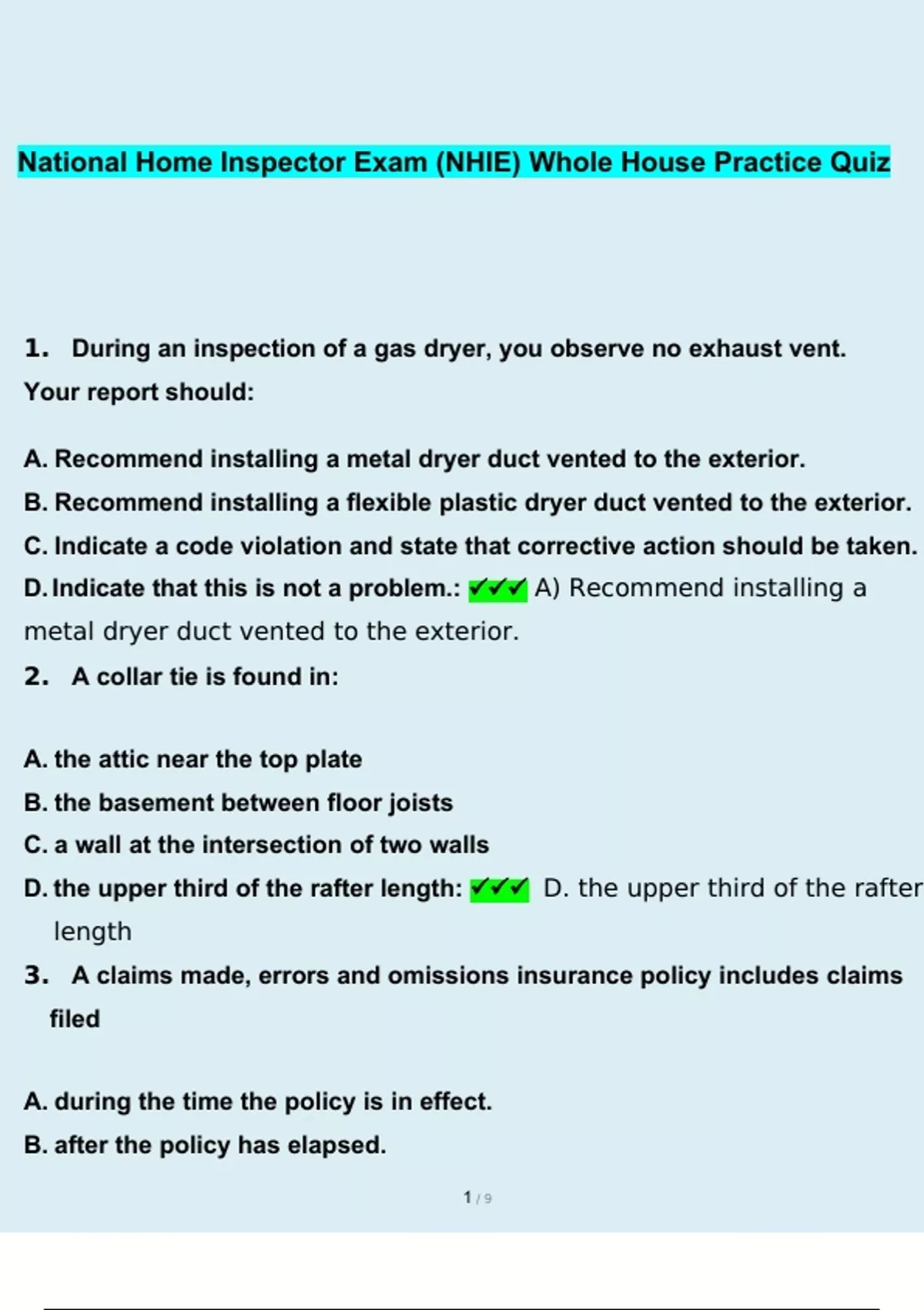 National Home Inspector Exam (NHIE) Whole House Practice Quiz 2023 Graded A+