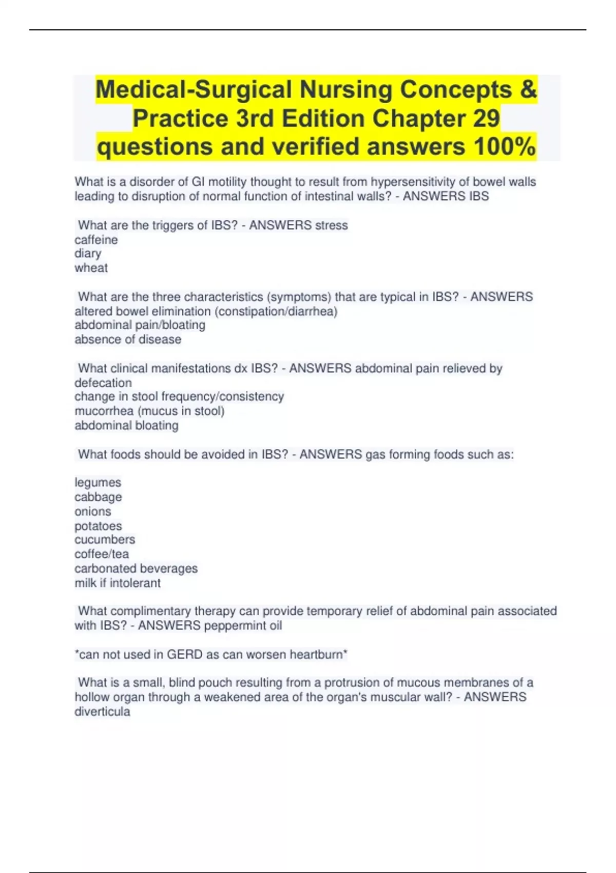 Medical-Surgical Nursing Concepts & Practice 3rd Edition Chapter 29 questions and verified answers 100% What is a disorder of GI motility thought to result from hypersensitivity of bowel walls leading to disruption of normal function of intestinal walls? - ANSWERS IBS What are the triggers of IBS? - ANSWERS stress caffeine diary wheat What are the three characteristics (symptoms) that are typical in IBS? - ANSWERS altered bowel elimination (constipation/diarrhea) abdominal pain/bloating absence of disease What clinical manifestations dx IBS? - ANSWERS abdominal pain relieved by defecation change in stool frequency/consistency mucorrhea (mucus in stool) abdominal bloating What foods should be avoided in IBS? - ANSWERS gas forming foods such as: legumes cabbage onions potatoes cucumbers coffee/tea carbonated beverages milk if intolerant What complimentary therapy can provide temporary relief of abdominal pain associated with IBS? - ANSWERS peppermint oil *can not used in GERD as can worsen heartburn* What is a small, blind pouch resulting from a protrusion of mucous membranes of a hollow organ through a weakened area of the organ's muscular wall? - ANSWERS diverticula What is the presence of diverticula? - ANSWERS diverticulosis What are the factors of development of colon diverticula? - ANSWERS intra-abdominal pressure (constipation) obesity low fiber diet What is inflamed or infected diverticula? - ANSWERS diverticulitis What is herniation of esophageal mucosa and submucosa? - ANSWERS esophageal diverticula What are the s/s of diverticulitis of the intestines? - ANSWERS rectal bleeding diarrhea or contipation acute LLQ pain bloating N/V What are the s/s of esophageal diverticula? - ANSWERS dysphagia regurgitation nocturnal cough halitosis How can diverticulosis be managed? - ANSWERS high fiber diet increase fluids bulk laxative or stool softeners How is diverticulitis treated? - ANSWERS antidiarrheal meds clear liquid diet for 2-3 days oral antibiotics mild pain meds for abdominal discomfort How are recurrent episodes of diverticulitis, perforation, and peritonitis treated? - ANSWERS surgical removal of affected part of the colon How does meperidine effect the elderly? - ANSWERS they have difficulty metabolizing and eliminating it, leading to toxicity causing seizures/confusion What is a sudden or gradual blockage of the intestinal tract that prevents the normal passage of contents through the intestines? - ANSWERS intestinal obstruction What is twisting of the bowel? - ANSWERS volvulus What is telescoping of one part of the bowel into itself? - ANSWERS intussusception What is failure of forward movement of bowel contents? - ANSWERS paralytic ileus Why are the elderly more prone to twisting of the bile and intestinal obstruction? - ANSWERS decreased muscle tone What are the s/s of the elderly that may indicate an obstruction? - ANSWERS sudden abdominal pain vomiting abdominal distention with palpable mass increased bowel sounds signs of dehydration What are the characteristics of a high intestinal obstruction? - ANSWERS sharp, brief upper abdominal pains frequent, high pitched sounds at obstruction absent bowels sounds below obstruction What is the meaning of lysed? - ANSWERS broken apart What is a protrusion of the intestine through the abdominal wall? - ANSWERS hernia What are the most common factors in the development of a hernia? - ANSWERS lifting heavy objects chronic cough straining to void/defecate ascites What is a hernia that can be returned to its' proper place by pressing on the organ? - ANSWERS reducible What is a hernia in which the protruding part of the organ is tightly wedged outside the cavity and cannot be pushed back inside? - ANSWERS irreducible or incarcerated What is a hernia in which blood supply is cut off from the protruding part of the organ? - ANSWERS strangulated or incarcerated What is a surgical procedure used to treat a hernia? - ANSWERS herniorrhaphy What is a surgical procedure to correct a hernia in which a strong synthetic material is sewn over the defect to reinforce the area? - ANSWERS hernioplasty What is a appliance used prevent protrusion of a hernia when surgery is not possible? - ANSWERS truss What are the s/s of bowel ischemia? - ANSWERS abdominal pain/cramps N/V/D abdominal tenderness guarding elevated wbc What is the treatment for bowel ischemia? - ANSWERS NPO NG tube IV hydration foley What two diseases are included in inflammatory bowel disease? - ANSWERS ulcerative colitis crohn's disease What is an inflammation with formation of ulcers of the mucosa of the colon? - ANSWERS ulcerative colitis