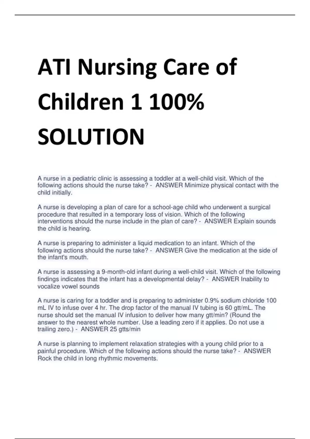 ATI Nursing Care of Children 1 100% SOLUTION A nurse in a pediatric clinic is assessing a toddler at a well-child visit. Which of the following actions should the nurse take? - ANSWER Minimize physical contact with the child initially. A nurse is developing a plan of care for a school-age child who underwent a surgical procedure that resulted in a temporary loss of vision. Which of the following interventions should the nurse include in the plan of care? - ANSWER Explain sounds the child is hearing. A nurse is preparing to administer a liquid medication to an infant. Which of the following actions should the nurse take? - ANSWER Give the medication at the side of the infant's mouth. A nurse is assessing a 9-month-old infant during a well-child visit. Which of the following findings indicates that the infant has a developmental delay? - ANSWER Inability to vocalize vowel sounds A nurse is caring for a toddler and is preparing to administer 0.9% sodium chloride 100 mL IV to infuse over 4 hr. The drop factor of the manual IV tubing is 60 gtt/mL. The nurse should set the manual IV infusion to deliver how many gtt/min? (Round the answer to the nearest whole number. Use a leading zero if it applies. Do not use a trailing zero.) - ANSWER 25 gtts/min A nurse is planning to implement relaxation strategies with a young child prior to a painful procedure. Which of the following actions should the nurse take? - ANSWER Rock the child in long rhythmic movements. A nurse in a pediatric clinic is caring for a 3-year-old child who has a blood lead level of 3 mcg/dL. When teaching the toddler's parent about the correlation of nutrition with lead poisoning, which of the following information is appropriate for the nurse to include in the teaching? - ANSWER ensure the Childs dietary intake of calcium and iron is adequate A nurse is assisting a provider during a femoral venipuncture on a toddler. The nurse should place the child in which of the following positions? - ANSWER Supine A nurse is assessing a 3-year-old child who is 1 day postoperative following a tonsillectomy. Which of the following methods should the nurse use to determine if the child is experiencing pain? - ANSWER use the FACES scale. A nurse is caring for a preschool-age child who is dying. Which of the following findings is an age-appropriate reaction to death by the child? (Select all that apply.) - ANSWER the child views death as similar to sleep The child believes his thoughts can cause death The child thinks death is a punishment A nurse is planning to collect a specimen from a male infant using a urine collection bag. Which of the following actions should the nurse take? - ANSWER Wash and dry the infant's genitalia and perineum thoroughly. A nurse is teaching the parent of a toddler about home safety. Which of the following statements by the parent indicates an understanding of the teaching? - ANSWER I lock my medications in the medicine cabinet A nurse in the emergency department is caring for a 12-year-old child who has ingested bleach. Which of the following statements by the nurse indicates an understanding of this ingestion? - ANSWER Injury by a corrosive liquids permits larger areas of contact with tissues and results in more extensive injury. A nurse is assessing a 30-month-old toddler during a well-child visit. Which of the following findings requires further assessment by the nurse? - ANSWER Birth weight is tripled A nurse is assessing a 30-month-old toddler during a well-child visit. Which of the following findings requires further assessment by the nurse? - ANSWER Building a tower of blocks A nurse in the emergency department is caring for a 2-year-old child who was found by his parents crying and holding a container of toilet bowl cleaner. The child's lips are edematous and inflamed, and he is drooling. Which of the following is the priority action by the nurse? - ANSWER check the child's respiratory status.