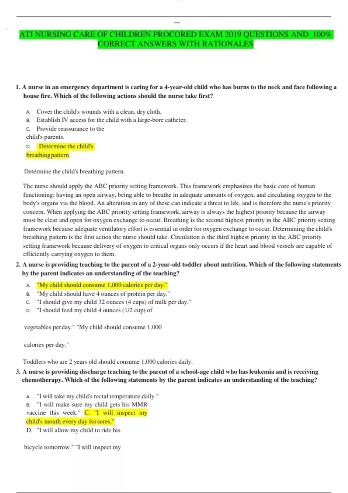NURSING CARE OF CHILDREN PROCORED EXAM 2023 QUESTIONS AND 100% CORRECT ANSWERS WITH RATIONALES ATI 1. A nurse in an emergency department is caring for a 4-year-old child who has burns to the neck and face following a house fire. Which of the following actions should the nurse take first? A. Cover the child's wounds with a clean, dry cloth. B. Establish IV access for the child with a large-bore catheter. C. Provide reassurance to the child's parents. D. Determine the child's breathing pattern . Determine the child's breathing pattern. The nurse should apply the ABC priority setting framework. This framework emphasizes the basic core of human functioning: having an open airway, being able to breathe in adequate amounts of oxygen, and circulating oxygen to the body's organs via the blood. An alteration in any of these can indicate a threat to life, and is therefore the nurse's priority concern. When applying the ABC priority setting framework, airway is always the highest priority because the airway must be clear and open for oxygen exchange to occur. Breathing is the second highest priority in the ABC priority setting framework because adequate ventilatory effort is essential in order for oxygen exchange to occur. Determining the child's breathing pattern is the first action the nurse should take. Circulation is the third highest priority in the ABC priority setting framework because delivery of oxygen to critical organs only occurs if the heart and blood vessels are capable of efficiently carrying oxygen to them. 2. A nurse is providing teaching to the parent of a 2-year-old toddler about nutrition. Which of the following statements by the parent indicates an understanding of the teaching? A. "My child should consume 1,000 calories per day." B. "My child should have 4 ounces of protein per day." C. "I should give my child 32 ounces (4 cups) of milk per day." D. "I should feed my child 4 ounces (1/2 cup) of vegetables per day." "My child should consume 1,000 calories per day." Toddlers who are 2 years old should consume 1,000 calories daily. 3. A nurse is providing discharge teaching to the parent of a school-age child who has leukemia and is receiving chemotherapy. Which of the following statements by the parent indicates an understanding of the teaching? A. "I will take my child's rectal temperature daily." B. "I will make sure my child gets his MMR vaccine this week." C. "I will inspect my child's mouth every day for sores." D. "I will allow my child to ride his bicycle tomorrow." "I will inspect my child's mouth every day for sores." A child who has leukemia is at an increased risk for mucositis; therefore, the parent should inspect the child's mouth daily for lesions or ulcerations. Page 1 of 10 lOMoAR cPSD| 4. A nurse is preparing to obtain an antistreptolysin O (ASO) titer from a child who has acute glomerulonephritis. The child's parent asks the nurse to explain the purpose of the test. Which of the following responses should the nurse make? A. "The test determines the level of antibiotics in your child's blood." B. "The test tells us if your child ever had the measles." C. "The test verifies the amount of albumin in your child's blood." D. "The test shows us if your child had a recent strep infection." "The test shows us if your child had a recent strep infection."