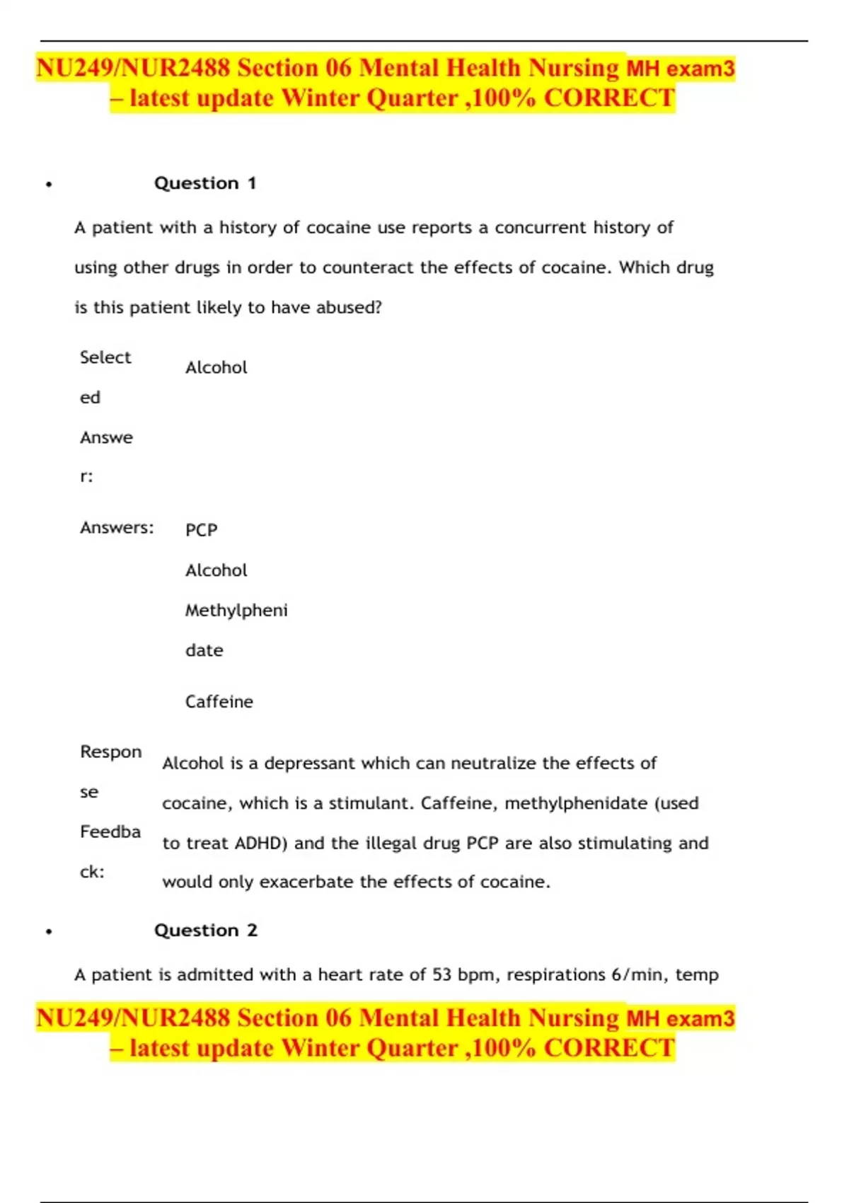 NU249/NUR2488 Section 06 Mental Health Nursing MH exam3 – latest update Winter Quarter ,100% CORRECT • Question 1 A patient with a history of cocaine use reports a concurrent history of using other drugs in order to counteract the effects of cocaine. Which drug is this patient likely to have abused? Selected Answer: Alcohol Answers: PCP Alcohol Methylpheni date Caffeine Response Feedback: Alcohol is a depressant which can neutralize the effects of cocaine, which is a stimulant. Caffeine, methylphenidate (used to treat ADHD) and the illegal drug PCP are also stimulating and would only exacerbate the effects of cocaine.