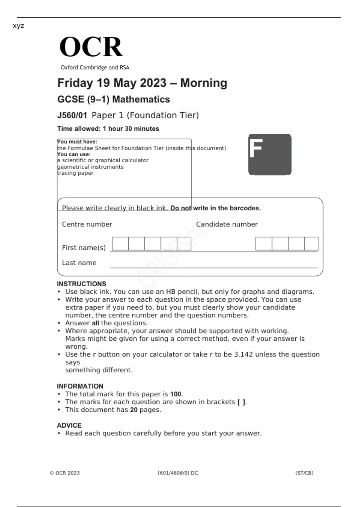 OCR GCSE (9–1) Mathematics J560/01 Paper 1 Foundation Tier JUNE 2023 QUESTION PAPER