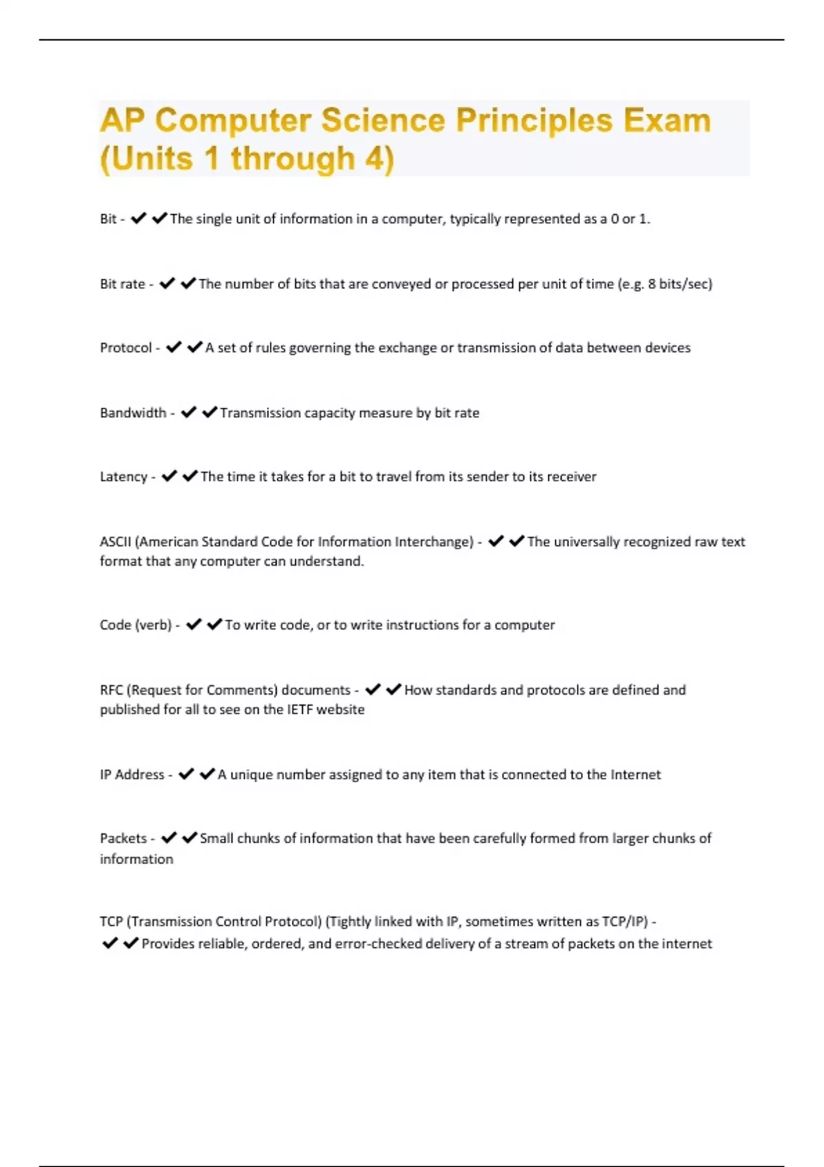 Bit - The single unit of information in a computer, typically represented as a 0 or 1. Bit rate - The number of bits that are conveyed or processed per unit of time (e.g. 8 bits/sec) Protocol - A set of rules governing the exchange or transmission of data between devices Bandwidth - Transmission capacity measure by bit rate Latency - The time it takes for a bit to travel from its sender to its receiver ASCII (American Standard Code for Information Interchange) - The universally recognized raw text format that any computer can understand. Code (verb) - To write code, or to write instructions for a computer RFC (Request for Comments) documents - How standards and protocols are defined and published for all to see on the IETF website IP Address - A unique number assigned to any item that is connected to the Internet Packets - Small chunks of information that have been carefully formed from larger chunks of information TCP (Transmission Control Protocol) (Tightly linked with IP, sometimes written as TCP/IP) - Provides reliable, ordered, and error-checked delivery of a stream of packets on the internetDNS (Domain Name System) - The Internet's system for converting alphabetic names into numeric IP addresses HTTP (Hypertext Transfer Protocol) - The protocol used by the World Wide Web that describes how messages are formatted and interchanged, and how web servers respond to commands Abstraction (Unit 1- on the Internet) - Reducing information and detail to focus on essential characteristics Server - A computer that awaits and responds to requests for data. Client - A computer that requests data stored on a server