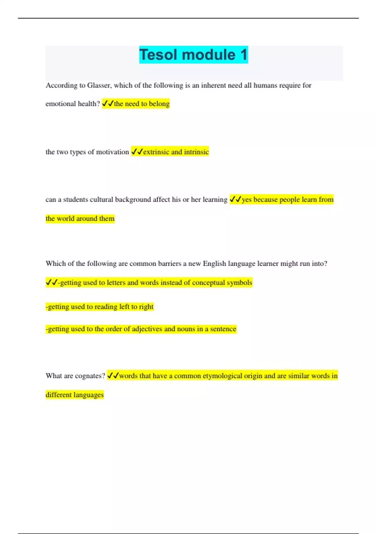 Tesol module 1 Questions with Correct Answers Rated A+ 2023