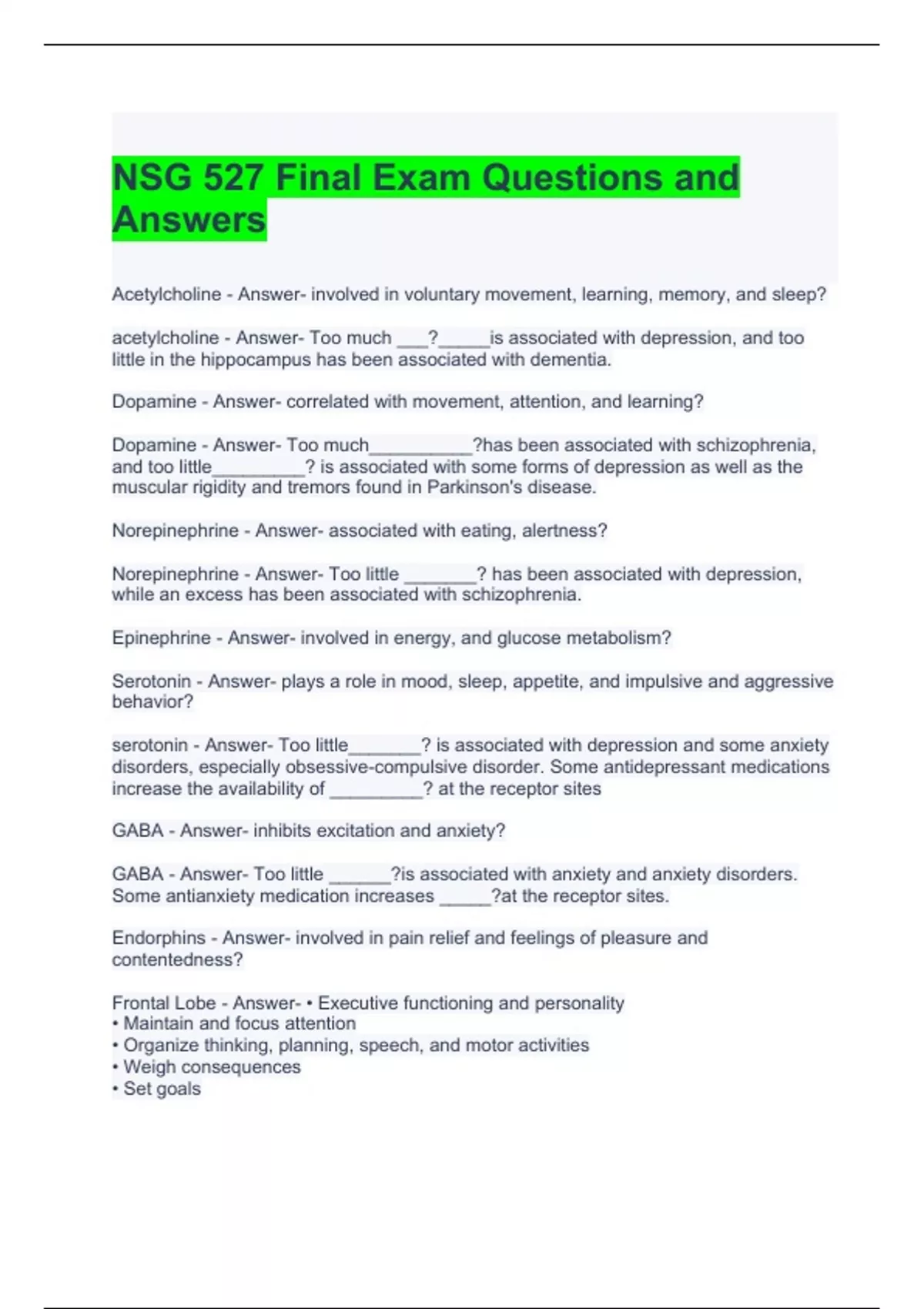 NSG 527 Final Exam Questions and Answers
