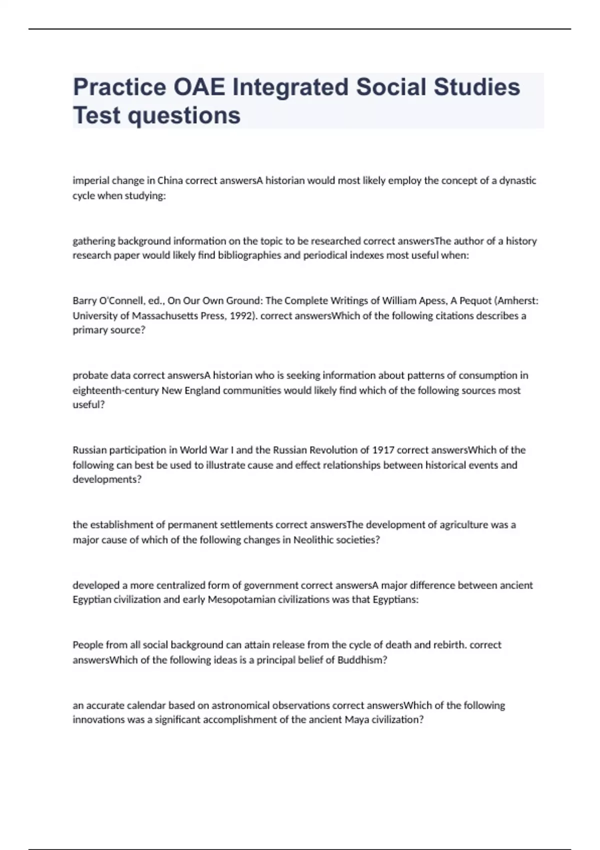 Practice OAE Integrated Social Studies Test questions with 100% correct answers