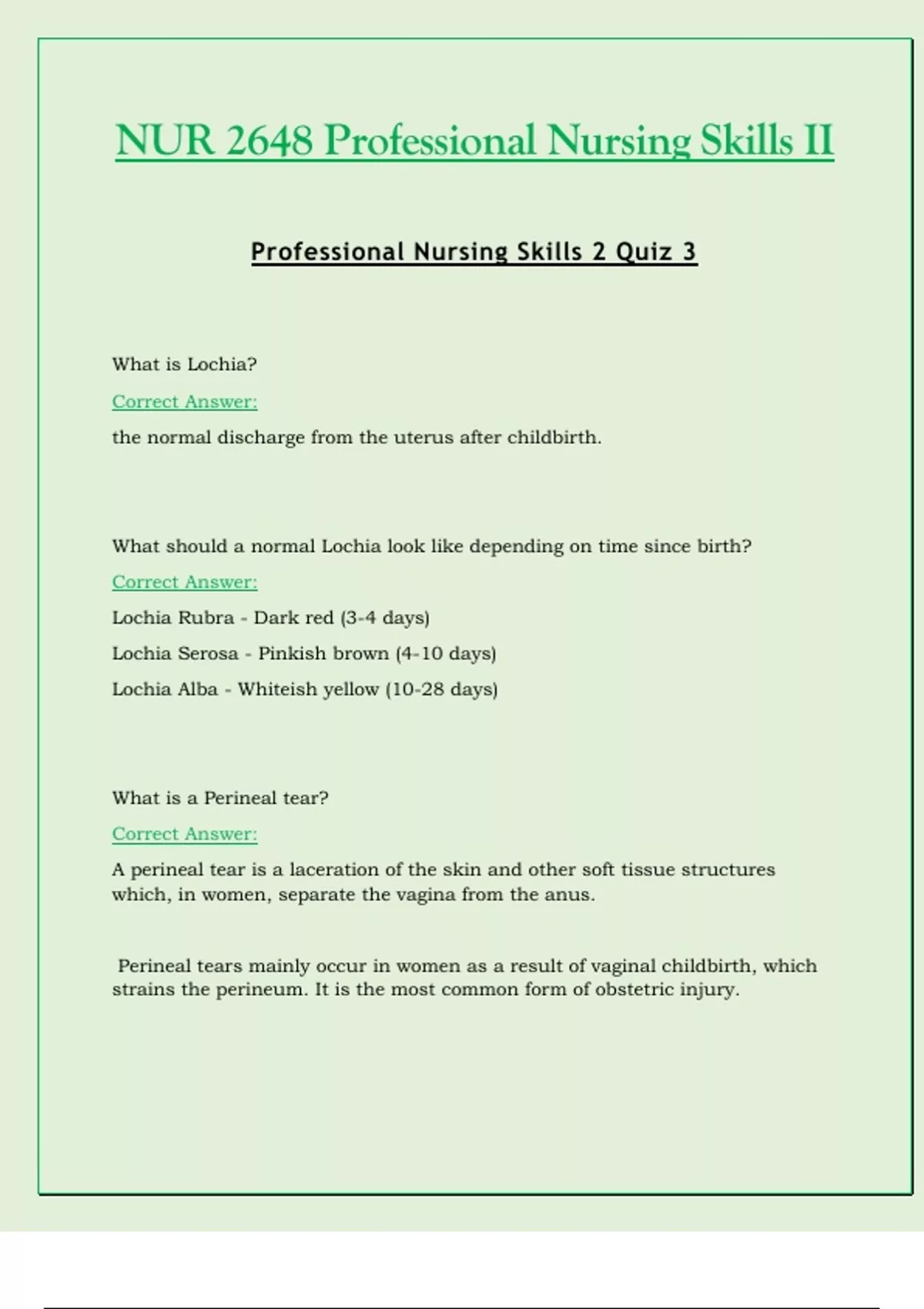 NUR 2648 Professional Nursing Skills II Professional Nursing Skills 2 Quiz 3 What is Lochia? Correct Answer: the normal discharge from the uterus after childbirth. What should a normal Lochia look like depending on time since birth? Correct Answer: Lochia Rubra - Dark red (3 -4 days) Lochia Serosa - Pinkish brown (4 -10 days) Lochia Alba - Whiteish yellow (10 -28 days) What is a Perineal tear? Correct Answer: A perineal tear is a laceration of the skin and other soft tissue structures which, in women, separate the vagina from the anus. Perineal tears mainly occur in women as a result of vaginal childbirth, whic h strains the perineum. It is the most common form of obstetric injury. What are the degrees of a Perineal tear? Correct Answer: 1st - vulva tear 2nd - vulva, perineum, perineal body 3rd - vulva, perineum, perineal body, anal sphincter 4th - vulva, perin eum, perineal body, anal sphincter, and rectum What are interventions that we should perform with a patient who has a Perineal tear? Correct Answer: Sutures Adhesive skin glue Ice What are actions contraindicated in the case of Perineal tear? Correct Answer: Midline episiotomy Nulliparity Operative vaginal delivery Increased fetal weight