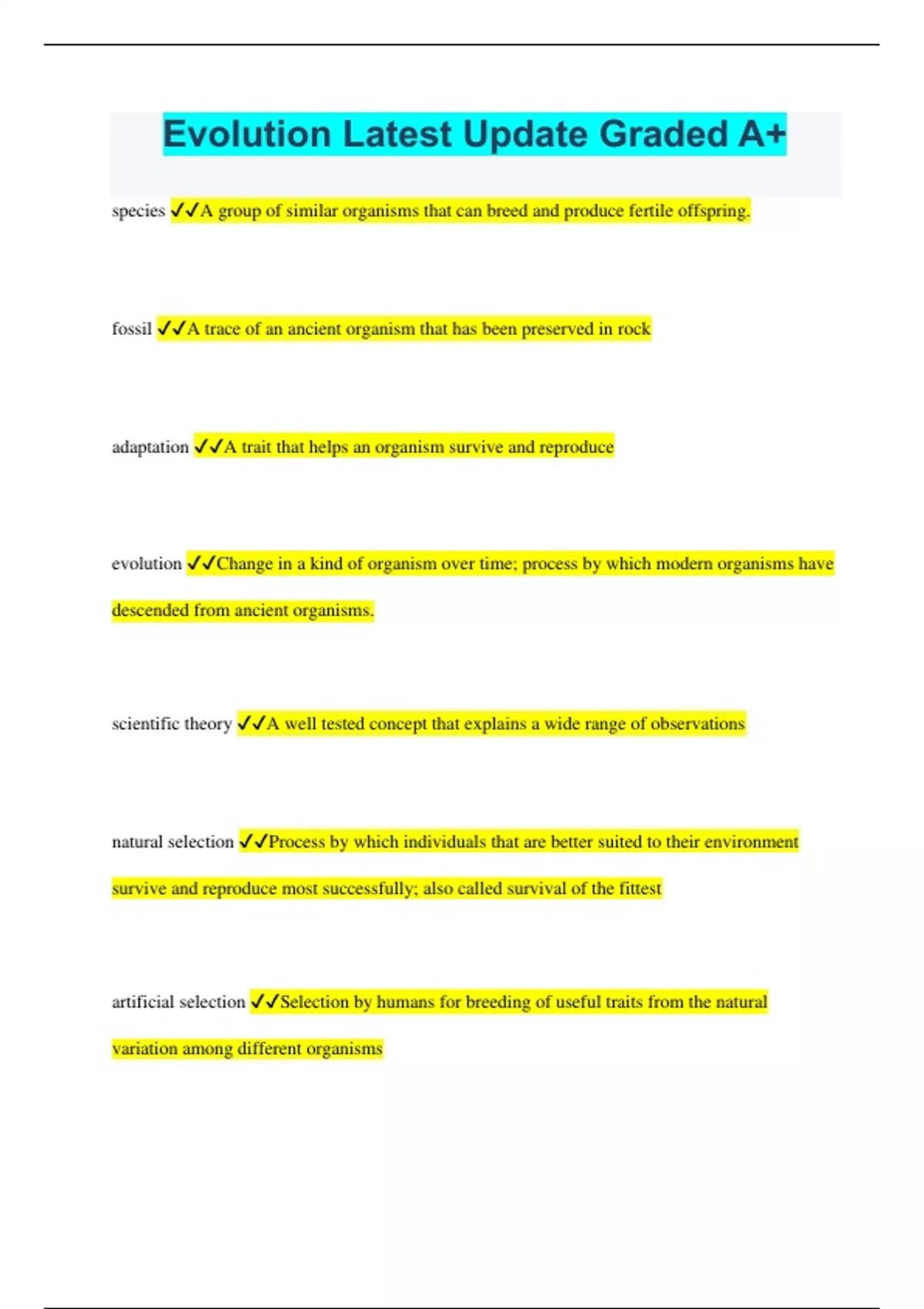 Evolution Latest Update Graded A+ species A group of similar organisms that can breed and produce fertile offspring. fossil A trace of an ancient organism that has been preserved in rock adaptation A trait that helps an organism survive and reproduce evolution Change in a kind of organism over time; process by which modern organisms have descended from ancient organisms. scientific theory A well tested concept that explains a wide range of observations natural selection Process by which individuals that are better suited to their environment survive and reproduce most successfully; also called survival of the fittest artificial selection Selection by humans for breeding of useful traits from the natural variation among different organisms variation Difference among members of a species. homologous structures Structures in different species that are similar because of common ancestry. gradualism The theory that evolution occurs slowly but steadily punctuated equilibrium Pattern of evolution in which long stable periods are interrupted by brief periods of more rapid change Charles Darwin Traveled to the Galapagos Islands on the HMS Beagle and later wrote the book "The Origin of Species." Overproduction Strategy in which organisms make more offspring than will actually survive. Competition Driving force of natural selection in which organisms fight for food, water, and living space Alfred Russel Wallace British naturalist who developed a hypothesis of natural selection similar to Darwin's Fossil Record All the fossils throughout the history of the Earth that are used as evidence of evolution. Common Ancestor An ancestral species from which later species evolved Embryology Study of developing embryos used as evidence of evolution. Vestigial Structures A structure that is present in an organism but no longer serves its original purpose (ex. hip bones in whales) DNA Genetic information that can be used as evidence of evolution between organisms. Isolation When members of a species become separated which may lead to the evolution of new species. Evidence of Evolution 1) Fossil Record 2) Embryology 3) Homologous Structures 4) DNA 5) Vestigial Structures Barrier something that blocks the way; an obstacle (mountains, rivers, etc.)