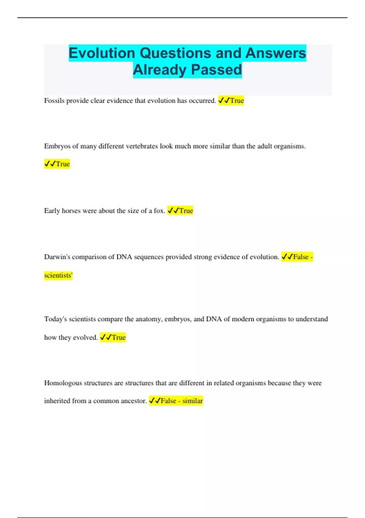 Evolution Questions and Answers Already Passed Fossils provide clear evidence that evolution has occurred. True Embryos of many different vertebrates look much more similar than the adult organisms. True Early horses were about the size of a fox. True Darwin's comparison of DNA sequences provided strong evidence of evolution. False - scientists' Today's scientists compare the anatomy, embryos, and DNA of modern organisms to understand how they evolved. True Homologous structures are structures that are different in related organisms because they were inherited from a common ancestor. False - similar Comparative anatomy is the study of the similarities and differences in the structures of different species. True Homologous embryology is the study of the similarities and differences in the embryos of different species. False - comparative embryology Analogous structures are structures that are similar in related organisms. False - unrelated organisms Peter and Rosemary Grant were actually able to observe evolution by natural selection taking place. True The wings of bats and birds serve the same function and are homologous structures. False - analogous structures Adaptive radiation is when one species evolves into a new species to fill an available niche. False - many new species Biogeography is the study of how and why plants and animals live where they do. True The Galápagos finches have provided a tremendous amount of information about evolution. True DNA sequence similarities are the strongest evidence for evolution from a common ancestor. True What is biogeography and what does it provide? Biogeography is the study of how and why plants and animals live where they do. It provides more evidence for evolution. Where do all camels come from? All of today's camels are descended from the same camel ancestors. These ancestors lived in North America about a million years ago. Why did camels evolve? They evolved adaptations that suited them for the particular environment where they lived. What is adaptive radiation? Give an example. Adaptive radiation is the process by which a single species evolves into many new species to fill available niches. For example, Darwin's finches evolved from one common ancestor. This ancestor evolved into many different species depending on food type. What did the Grants study? What did they observe? The Grants studied Darwin's finches. They observed evolution by natural selection taking place when a drought occurred. Birds with bigger beaks survived and reproduced because they could eat all sizes of seeds, whereas small-beaked birds could only eat small seeds. Evidence of evolution includes _____. DNA sequence analysis the fossil record anatomical evidence Which of the following is true about horse evolution? (1) Early horses were about the size of a fox. (2) Early horses had toes. (3) During evolution, their molars became covered with cement. 1, 2, and 3 Examples of analogous structures are _____. the wings of bats and birds An example of a vestigial structure is the _____. human tail bone The strongest evidence for evolution from a common ancestor is _____. similar DNA sequences Island biogeography _____. provides information on the migration and evolution of the finch Biogeography shows that all camels _____. came from ancestors that lived in North America Peter and Rosemary Grant _____. actually observed evolution by natural selection taking place the strongest evidence for evolution from a common ancestor DNA sequences shows how organisms are related by descent from common ancestors cladogram structures that are similar in related organisms because they were inherited from a common ancestor homologous structure scientists who find and study fossils paleontologist structures that are similar in unrelated organisms analogous structure provide clear evidence that evolution has occurred fossils reduced structures that are no longer used vestigial structure the process by which a single species evolves into many new species to fill available niches adaptive radiation the study of the similarities and differences in the embryos of different species comparative embryology the study of how and why plants and animals live where they do biogeography the study of the similarities and differences in the structures of different species comparative anatomy Humans and apes are evolutionarily closely related, based on analysis of their _____. DNA sequences Wings of bats and birds serve the same function and are ____________ structures. analogous Comparative _____ is the study of the similarities and differences in the structures of different species. anatomy _____ demonstrate that during the evolution of the whale, the whale moved from land into the sea. fossils The human tail bone and appendix are _____ structures. vestigial _____ structures are structures that are similar in related organisms because they were inherited from a common ancestor. homologous Comparative _____ is the study of the similarities and differences in the embryos of different species. embryology Early North American camels migrated to other places, some crossing a land bridge during the last _____. ice age The forelimbs of all mammals have the same basic bone _____. pattern/structure Scientists who find and study fossils are called _____. paleontologists Peter and Rosemary Grant studied Darwin's _____ in the Galápagos Islands. finches The biogeography of _____ yields some of the best evidence for evolution. finches As recently as 200 years ago, many people believed that Earth was only 6,000 years old. True Artificial selection occurs when nature selects for beneficial traits. False - humans The individual Galápagos Islands are all similar to each other. False - different Malthus argued that human populations grow faster than their resources. True Lamarck was one of the first scientists to propose that species evolve by natural selection. False - inheritance of acquired characteristics Lyell was 