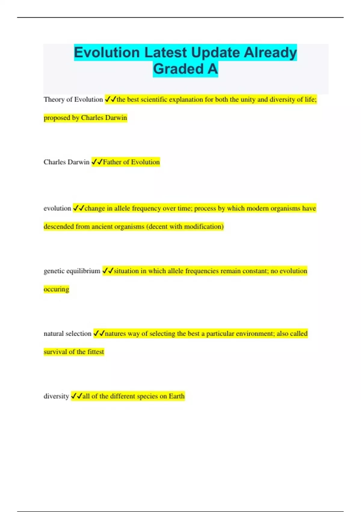Evolution Latest Update Already Graded A Theory of Evolution the best scientific explanation for both the unity and diversity of life; proposed by Charles Darwin Charles Darwin Father of Evolution evolution change in allele frequency over time; process by which modern organisms have descended from ancient organisms (decent with modification) genetic equilibrium situation in which allele frequencies remain constant; no evolution occuring natural selection natures way of selecting the best a particular environment; also called survival of the fittest diversity all of the different species on Earth variation the differences within a single species species group of similar organisms capable of interbreeding and producing fertile offspring speciation formation of new species common ancestry a group of organisms share common descent if they have a common ancestor biogeography the study of the distribution of species and ecosystems in geographic space and through geological time; evidence of common ancestry fossil record the geological record of organisms on earth that have been preserved in the rock in a chronological order (oldest on bottom); evidence of common ancestry embryology the study of embryos; evidence of common ancestry molecular homology similar amino acid sequences (DNA) among different species from a common ancestor; evidence of common ancestry homologous structures structures that have different mature forms in different organisms but develop from the same embryonic tissues; evidence of common ancestry analogous structures is a trait or an organ that appears similar in two unrelated organisms vestigial structure a structure that an organism has that is no longer useful to it, but that they have this structure because a common ancestor to that organism found it useful fitness ability of an organism to survive and reproduce in its environment adaptation inherited characteristic that increases an organism's chance of survival mimicry the similarity of one species to another which protects one or both camouflage when an organism blends in with its environment for protection against predators cladogram diagram that shows the evolutionary relationships among a group of organisms derived characteristics characteristic that appears in recent parts of a lineage, but not in its older members divergent evolution (adaptive radiation) process by which a single species or small group of species evolves into several different forms that live in different ways convergent evolution process by which unrelated organisms independently evolve similarities when adapting to similar environments coevolution the evolution of two or more interdependent species, each adapting to changes in the other gradualism when speciation occurs over long periods of time rather than by sudden major changes punctuated equilibrium pattern of evolution in which long stable periods (stasis) are interrupted by brief periods of rapid change extinction disappearance of a species from all parts of its geographical range gene pool the sum of all the genes in an interbreeding population allele frequency number of times an allele occurs in a gene pool inherited vs. acquired traits characteristic passed on via genetic material vs. physical characteristic that is not inherited but may be an effect of the environment single-gene trait trait controlled by a single gene (ex: widow's peak in humans) polygenic trait trait controlled by two or more genes (ex: skin color of humans) stabilizing selection form of natural selection that occurs when individuals near the center of a distribution curve have higher fitness than individuals at either end directional selection form of natural selection that occurs when individuals at one end of a distribution curve have higher fitness than individuals in the middle or at the other end of the curve disruptive selection form of natural selection that occurs when individuals at both ends of a distribution curve have higher fitness than individuals near the middle reproductive isolation the inability of a species to breed successfully with related species due to geographical, behavioral, physiological, or genetic barriers or differences behavioral isolation form of reproductive isolation in which two populations have differences in courtship rituals or other types of behavior that prevent them from interbreeding geographic isolation form of reproductive isolation in which two populations are separated physically by geographic barriers such as rivers, mountains, or stretches of water temporal isolation form of reproductive isolation that occurs when members of two species occupy similar habitats, but breed at different times natural resistance ex: bacterial resistance to antibiotics or insects resistant to pesticides/insecticides gene flow is the transfer of alleles or genes from one population to another genetic drift change in allele frequencies of a population due to chance or random events rather than by natural selection mutation a random change in the DNA that can possibly be beneficial and can produce genetic variation in a species crossing over also called gene shuffling or genetic recombination; produces genetic variation in a species