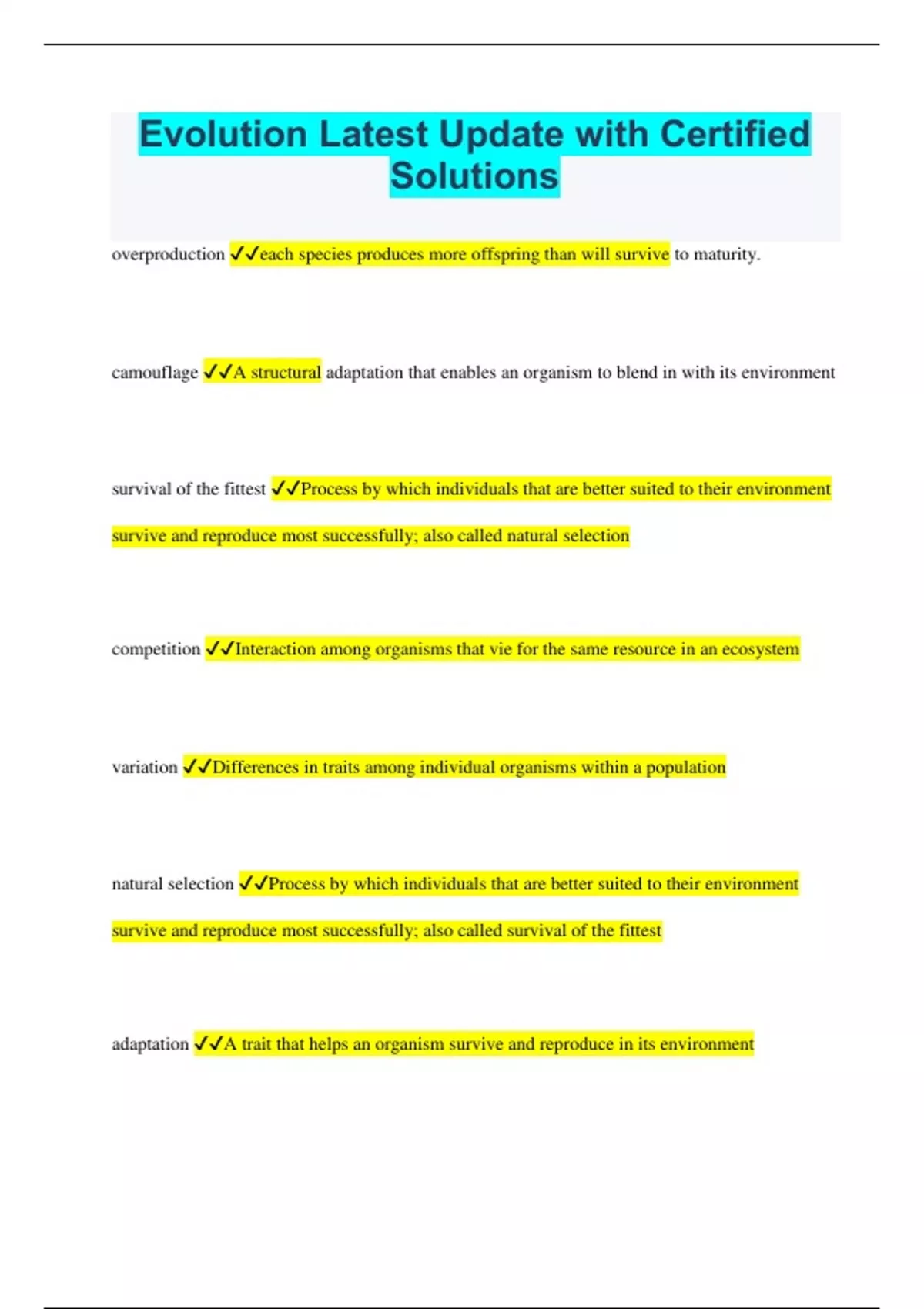 Evolution Latest Update with Certified Solutions overproduction each species produces more offspring than will survive to maturity. camouflage A structural adaptation that enables an organism to blend in with its environment survival of the fittest Process by which individuals that are better suited to their environment survive and reproduce most successfully; also called natural selection competition Interaction among organisms that vie for the same resource in an ecosystem variation Differences in traits among individual organisms within a population natural selection Process by which individuals that are better suited to their environment survive and reproduce most successfully; also called survival of the fittest adaptation A trait that helps an organism survive and reproduce in its environment mimicry Gaining protection by looking and acting like a different species vestigial organ an organ that is not functional in an organism, but was functional at some period in its evolution favorable traits Offspring with favorable traits survive and reproduce, passing on their traits to another generation evolution Change over time Lamarck French naturalist who proposed that evolution resulted from the inheritance of acquired characteristics () Darwin A biologist who developed theory of evolution of species (1859). He argued that all living species evolved into their present form through the ability to adapt in a struggle for survival. Galapagos Islands Chain of islands near South America where Darwin developed his theory of natural selection by studying the unique life there. finches Observed by Darwin. Very similar, but differences can be seen in the size and shape of the bill and/or beak. mutation (genetics) any event that changes genetic structure use and disuse Theory proposed by Lamarck that said body parts develop with increased usage while unused parts weaken. "Use it or lose it!" Trait A characteristic that an organism can pass on to its offspring through its genes. Heredity Passing of traits from parents to offspring artificial selection Breeding organisms with specific traits in order to produce offspring with identical traits; SELECTIVE BREEDING Fossils Preserved remains of once-living organisms; evidence for Evolution homologous structures Structures in different species that are similar because of common ancestry but different because of adaptation to different environments. Analagous Structures similar structure without having a common ancestor evolutionary tree A branching diagram that reflects a hypothesis about evolutionary relationships among groups of organisms.