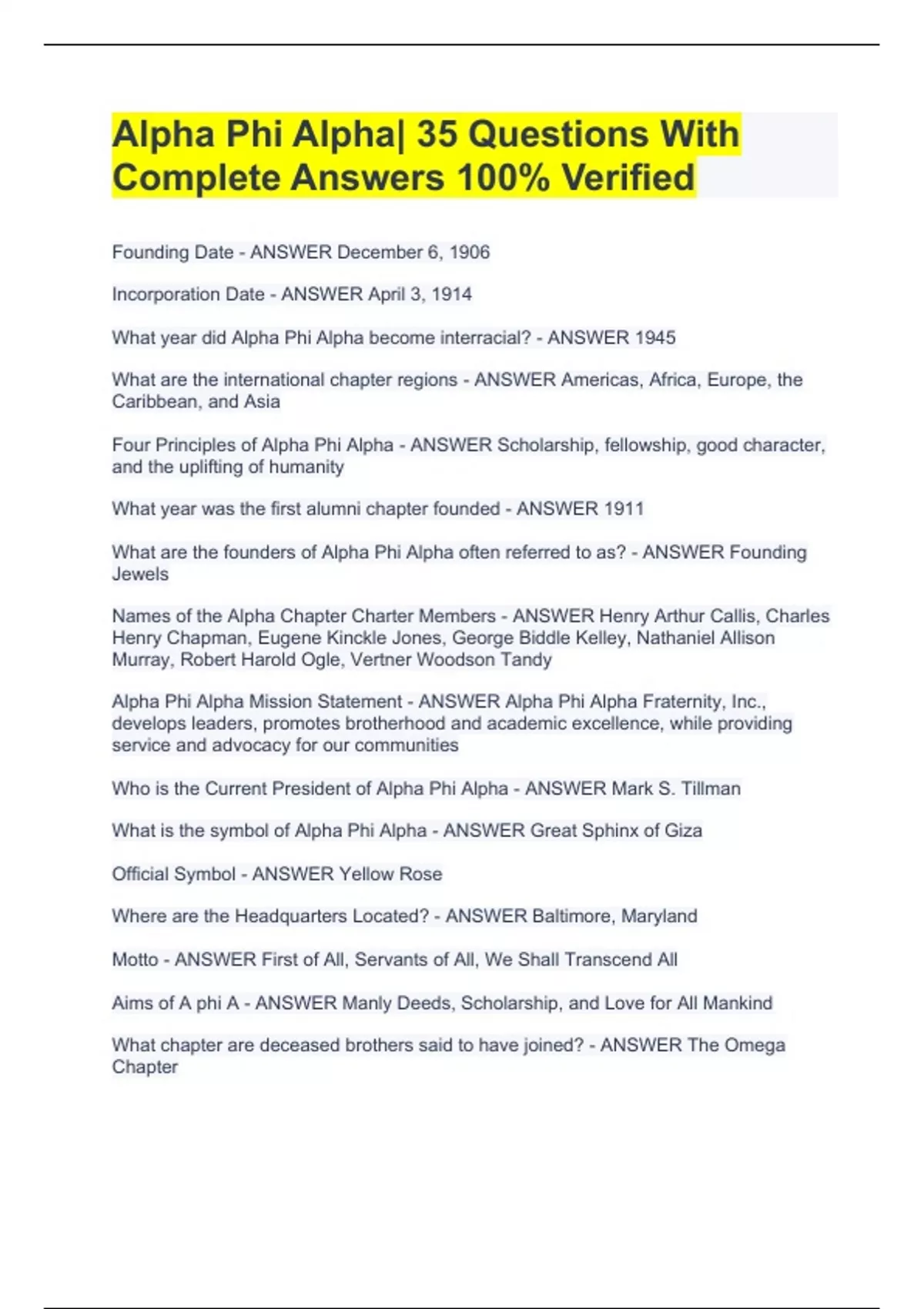 Founding Date - ANSWER December 6, 1906 Incorporation Date - ANSWER April 3, 1914 What year did Alpha Phi Alpha become interracial? - ANSWER 1945 What are the international chapter regions - ANSWER Americas, Africa, Europe, the Caribbean, and Asia Four Principles of Alpha Phi Alpha - ANSWER Scholarship, fellowship, good character, and the uplifting of humanity What year was the first alumni chapter founded - ANSWER 1911 What are the founders of Alpha Phi Alpha often referred to as? - ANSWER Founding Jewels Alpha Phi Alpha| 35 Questions With Complete Answers 100% Verified