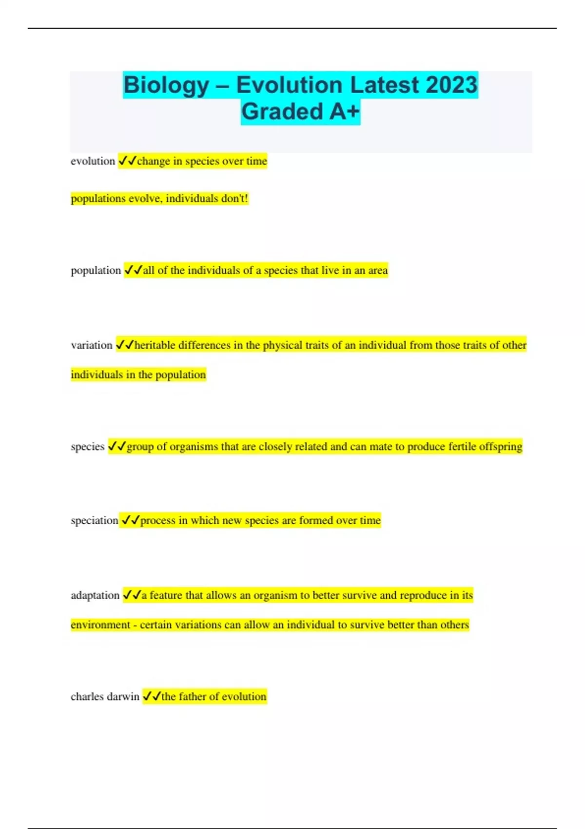 Biology – Evolution Latest 2023 Graded A+ evolution change in species over time populations evolve, individuals don't! population all of the individuals of a species that live in an area variation heritable differences in the physical traits of an individual from those traits of other individuals in the population species group of organisms that are closely related and can mate to produce fertile offspring speciation process in which new species are formed over time adaptation a feature that allows an organism to better survive and reproduce in its environment - certain variations can allow an individual to survive better than others charles darwin the father of evolution charles darwin's birth 1809, in england charles darwin's ship HMS Beagle charles darwin's discovery organisms change over time natural selection mechanism by which individuals that are better fit for their environment have a greater chance to survive and mate/reproduce mechanism of evolution how does evolution happen natural selection, mutations, artificial selection, geographic separation/isolation., genetic drift, gene flow(migration) organism with adaptation more common or frequent over time organism without adaptation less common or frequent over time principles of the theory of natural selection 1. variation 2. overproduction 3. adaptation 4. descent with modification overproduction not all offspring will survive due to competition descent with modification the number of individuals with the advantageous adaptations will increase over each generation natural selection acts on... traits that already exist phenotypes: new alleles occur by genetic mutations artificial selection the process by which humans change a species by breeding it for certain traits fossil trace of a dead organism types of dating for fossils radiometric and relative radiometric dating uses the known time of natural decay of unstable isotopes to calculate the age of the materials relative dating estimates the age of fossils by comparing the fossils found in certain rock layers to those in other layers oldest fossils found in the bottom of the rock youngest fossils closest to the surface fossil doesn't form decomposition takes place biogeography study of the geographic distribution of plants, animals and fossils homologous structures common ancestor similar structure different function examples of homologous structures bones of a cat, human, whale, and bat are similar but have different functions analogous structures not related different structures same function examples of analogous structures bird wing and insect wing quills on a sea urchin, hedgehog, and cactus vestigial structures no useful purpose examples of vestigial structures pelvic bone in a whale human appendix human canine teeth and wisdom teeth embryology similarities in embryological development among organisms is further evidence of shared common ancestry molecular evidence more similarities in DNA between 2 organisms, the more closely related they are; the more differences, the more distantly related gene pool combined alleles of all the individuals in a population alleles difference forms of a gene frequency how often something occurs over time genetic variation in a population increases the chance that some individuals will survive genetic variation sources mutations recombination mutations random change in the DNA of a gene; is the change occurs in the DNA of a reproductive cell then it will passed on to the offspring recombination new allele combinations in an offspring that occurred during meiosis through crossing over and independent assortment gene flow movement of alleles from one population to another increases genetic variation of the receiving population migration (immigration, emigration) other word for gene flow lack of gene flow leads to formation of different species genetic drift change in allele frequency due to chance; results in loss of diversity types of genetic drift bottleneck effect founder effect bottleneck effect when a population is drastically decreased due to a natural disaster founder effect when a small group splits off from a larger population and starts their own population isolated from the original population random mutation -can happen to one individual in a population and can be beneficial, harmful, or neutral -can increase chances of survival and reproduction -can decrease chances of of survival -might not affect an indivduals ability to survive and reproduce and will become a natural variation instead of a mutations sexual selection occurs when certain traits increase mating success hardy-weinburg 1908-two scientists created an equation to test these ideas of probability and chance hardy-weinberg principle the frequency of alleles in a population does not change unless evolutionary forces act on population characteristics of a hardy-weinberg population -very large population -no migration -no mutations -random mating -no natural selection reproductive isolation -when members of different populations of the same species can no longer mate successfully -can lead to speciation 3 barriers that can cause reproduction isolation to occur behavioral barriers geographical barriers temporal barriers behavioral barriers courtship or mating behaviors are now different in the populations geographical barriers physical separation of the populations temporal barriers the two populations aren't ready to mate at the same time of day convergent evolution individuals share similarities not because they are related but because they need certain adaptations to survive in their environment; therefore, they have analogous structures parallel evolution another word for convergent evolution divergent evolution the process by which one species begins to split into two distinct groups with different traits; therefor they have homologous structures adaptive radiation another word for divergent evolution and may lead to speciation phylogenetic tree a diagram showing the