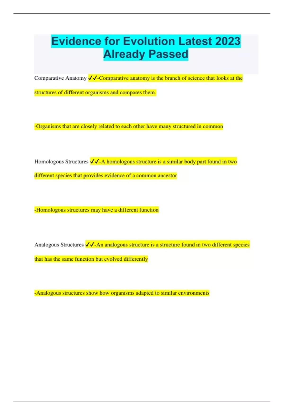 Evidence for Evolution Latest 2023 Already Passed Comparative Anatomy -Comparative anatomy is the branch of science that looks at the structures of different organisms and compares them. -Organisms that are closely related to each other have many structured in common Homologous Structures -A homologous structure is a similar body part found in two different species that provides evidence of a common ancestor -Homologous structures may have a different function Analogous Structures -An analogous structure is a structure found in two different species that has the same function but evolved differently -Analogous structures show how organisms adapted to similar environments Vestigial Structure -A vestigial structure is a structure that has evolved to no longer be used by an organism -Vestigial structures were once fully functional in an ancestor Homologous structures A. always have the same function. B. are found in organisms of the same species. C. always have a different function. X D. are found in organisms of different species. Snakes have remnants of back legs Vestigial Structure Bats have the same arm bone structure as cats. homologous structure Frogs, humans, and whales have a backbone. homologous structure Bats and moths both have wings, but not a common ancestor. analogous structure: Embryology -Embryology is the study of the development of an embryo -Embryos of different organisms look very similar, which shows that the organisms share a common ancestor -Certain traits appear in early embryos but may disappear before the organism is fully developed *Gills *Tails Which traits do human embryos have that link them to a common ancestor with fish and reptiles? Check all that apply. hair X tail scales yolk sac X gill slits The chart shows information about three different embryos early in their development. Which is best supported by the information in the chart? D. Species X and Y are related to humans. Pelvic bones in whales are an example of BLANK structures. vestigial Which is an example of using comparative anatomy to study evolutionary relationships? B. studying the digestive system structure in two organisms BLANK structures are fully functional, show evidence of a common ancestor, and may or may not have the same function in different species. Homologous The diagram shows the structures of horse and cat forelimbs. What does the diagram suggest about the evolutionary relationship between these two mammals? A. They have homologous structures, indicating a common ancestor. Embryos of different species look very similar, which shows that the organisms share a BLANK ancestor. Common Houseflies have very tiny hind wings that are too small to lift them off the ground. Scientists have observed fossils of an ancient insect they believe is related to houseflies. However, these insects had second pair of wings that were much bigger. How does this show support for the theory of evolution? A. Houseflies have a vestigial structure. Jonas drew a diagram to compare two kinds of evidence that support the theory of evolution. C. evidence of adaptations to similar environments The diagram shows a chicken embryo and a human embryo. Which is best supported by the diagram? B. Because their embryos have structures similar to gills, chickens and humans likely share a common ancestor with fish. Monkeys and bats have similar bone structure in their forelimbs. However, monkeys have longer forelimbs to use for climbing and swinging in trees. Bats have shorter forelimbs to use for flight. Which term best describes how monkey and bat forelimbs are related to each other? A. homologous Which traits do human embryos have that link them to a common ancestor with fish and reptiles? C. tail and gill slits A student is writing a paper to explain how scientists interpret this image. What is the student most likely explaining? D. embryology Which trait is found in early embryos of both birds and humans, but then disappears from each during development? D. gill slits Which supports the idea that birds and butterflies both have wings but they do not have a common ancestor with wings? A. The wings are analogous structures that evolved differently and do not have a similar internal structure.
