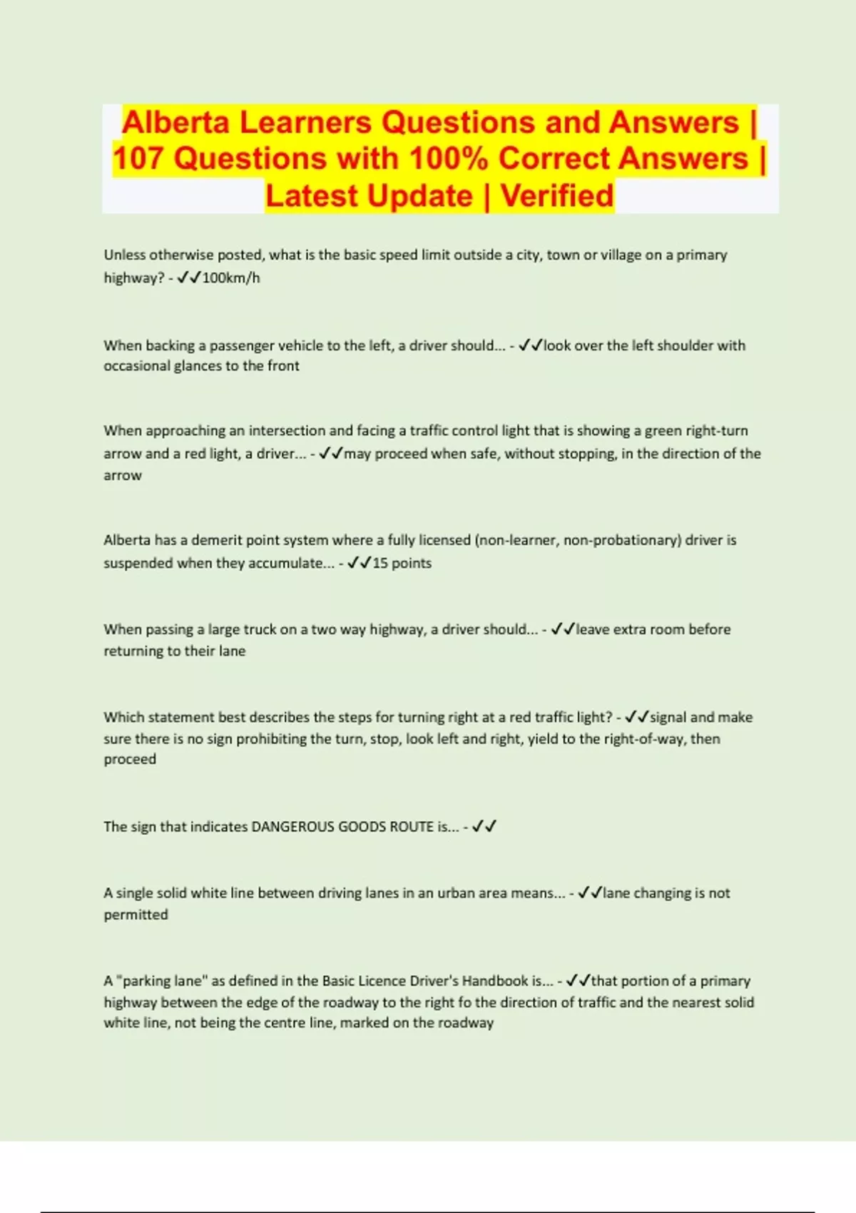Alberta Learners Questions and Answers | 107 Questions with 100% Correct Answers | Latest Update | Verified
