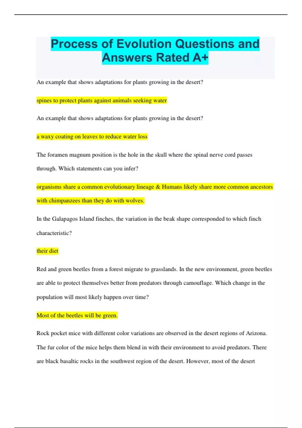 Process of Evolution Questions and Answers Rated A+ An example that shows adaptations for plants growing in the desert? spines to protect plants against animals seeking water An example that shows adaptations for plants growing in the desert? a waxy coating on leaves to reduce water loss The foramen magnum position is the hole in the skull where the spinal nerve cord passes through. Which statements can you infer? organisms share a common evolutionary lineage & Humans likely share more common ancestors with chimpanzees than they do with wolves. In the Galapagos Island finches, the variation in the beak shape corresponded to which finch characteristic? their diet Red and green beetles from a forest migrate to grasslands. In the new environment, green beetles are able to protect themselves better from predators through camouflage. Which change in the population will most likely happen over time? Most of the beetles will be green. Rock pocket mice with different color variations are observed in the desert regions of Arizona. The fur color of the mice helps them blend in with their environment to avoid predators. There are black basaltic rocks in the southwest region of the desert. However, most of the desert regions have sand that is light brown in color. Which two statements are true about the population of mice in both regions? Black mice will be better adapted in the black basaltic rock regions. & Light brown mice will be better adapted in the sandy regions of the desert. On island X, he saw both species of finches. On island Y, he only saw the finch on the right. Based on these observations, what is the most likely conclusion Darwin would have made? There was a variety of food available on island X, but there were only large seeds and nuts on island Y. provide evidence from developmental biology of a shared evolutionary history? Both lobsters and frogs go through metamorphosis as a process in their life cycle. How did the artificial selection practiced by pigeon breeders influence Darwin's theory of evolution by natural selection? Darwin concluded that if traits in captive pigeons could be selectively passed on to offspring, the selection of traits could also happen I nature, On the Galapagos Islands, Darwin observed tortoises with domed and saddle-shaped shells. How did Darwin's observations of these tortoises help him form the theory of evolution by natural selection? The tortoises provided evidence that different species have adaptations suited to their particular environments. Approximately 60% of human genes are also found in fruit flies. About 97.5% of human genes are also found in mice. What does this evidence suggest? Humans and mice share a more recent common ancestor than do humans and fruit flies. What did the evidence that Darwin collected during his voyage on the HMS Beagle allow him to accomplish? to propose the theory of evolution by natural selection Researchers have historically considered the human appendix to be a vestigial structure. What evidence, if true, would best disprove this claim? The human appendix helps to maintain the health of the gut, and arose fairly late in the evolutionary history of mammals. The images show the wings of two different organisms. The wings of the housefly and the bat are analogous structures. This indicates that their wings have different evolutionary lineages. Which field of study matches with "embryo of a pig and a calf" ? developmental biology Which field of study matches with "DNA of a pig and a calf" molecular biology Which field of study matches with " limb structure of a pig and a calf" comparative anatomy Based on this phylogenetic tree, which species is most closely related to Bos taurus? Ovis aries Giraffes with short necks lived in arid regions and fed on grasses. Over time, grasses disappeared, forcing giraffes to eat from trees. Mutations in the genome led to some giraffes inheriting the trait for long necks. Over time, there were more giraffes with long necks in the region. What are the two reasons for the change in the population of giraffes? adaptation & natural selection Match the characteristic with the correct evidence for evolution: The inner ear bones of mammals have evolved frombones that form the jaws of reptiles. homologous strucutures