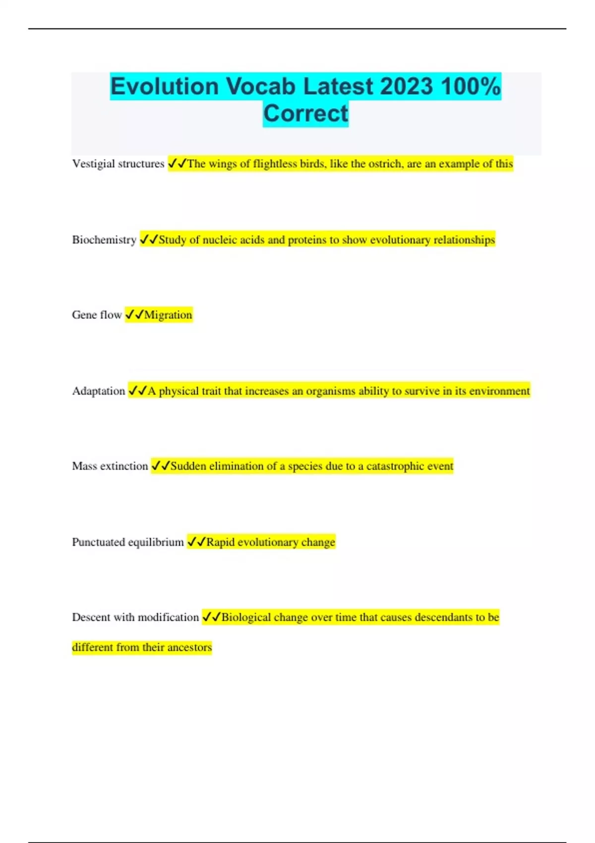 Evolution Vocab Latest 2023 100% Correct