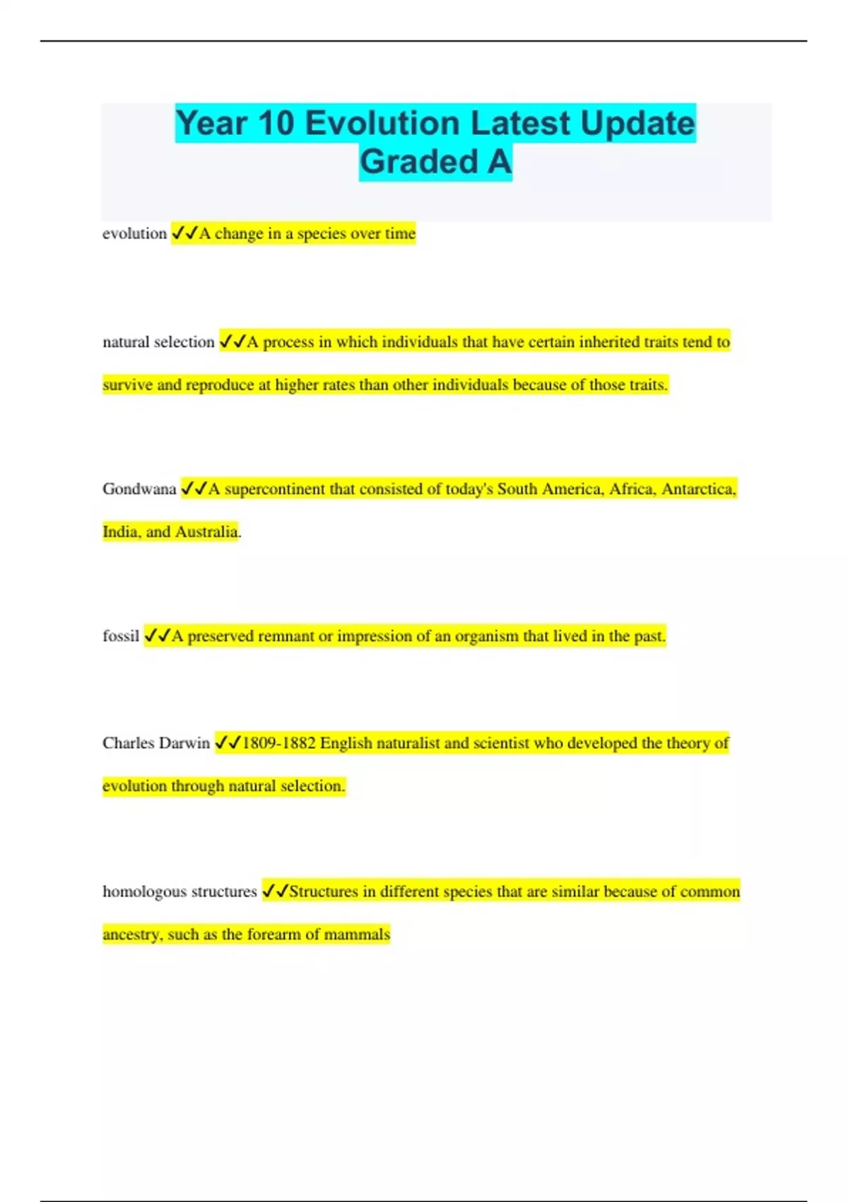 Year 10 Evolution Latest Update Graded A evolution A change in a species over time natural selection A process in which individuals that have certain inherited traits tend to survive and reproduce at higher rates than other individuals because of those traits. Gondwana A supercontinent that consisted of today's South America, Africa, Antarctica, India, and Australia. fossil A preserved remnant or impression of an organism that lived in the past. Charles Darwin English naturalist and scientist who developed the theory of evolution through natural selection. homologous structures Structures in different species that are similar because of common ancestry, such as the forearm of mammals mutation A change in a gene or chromosome that is the original cause of variation in living things species A group of similar organisms that can breed and produce fertile offspring. common ancestor An ancestor (distant relative) that two organisms have in common. extinction A species dies out forever. selection pressure Something in the environment that helps one trait survive better than the other trait adaptation A characteristic that improves an individual's ability to survive and reproduce in a particular environment. Variation The differences between individuals within a species. These variations help the organism survive in its environment. Divergent evolution When new species evolve from a common ancestor. Over time the two new species will not be able to interbreed, creating two new species. This could be due to Geographical isolation or environmental changes. Competition Individuals in a population competing for resources in an area. Convergent evolution Where similar selection pressures in an environment, produce similar adaptations in different species eg. dolphin and shark both develop fins for swimming. Analougus structures Unrelated species developing similar structures - living in similar environments, eg. bat and insect wings. Environmental changes Global warming, climate change, human activity, natural disasters and continental drift
