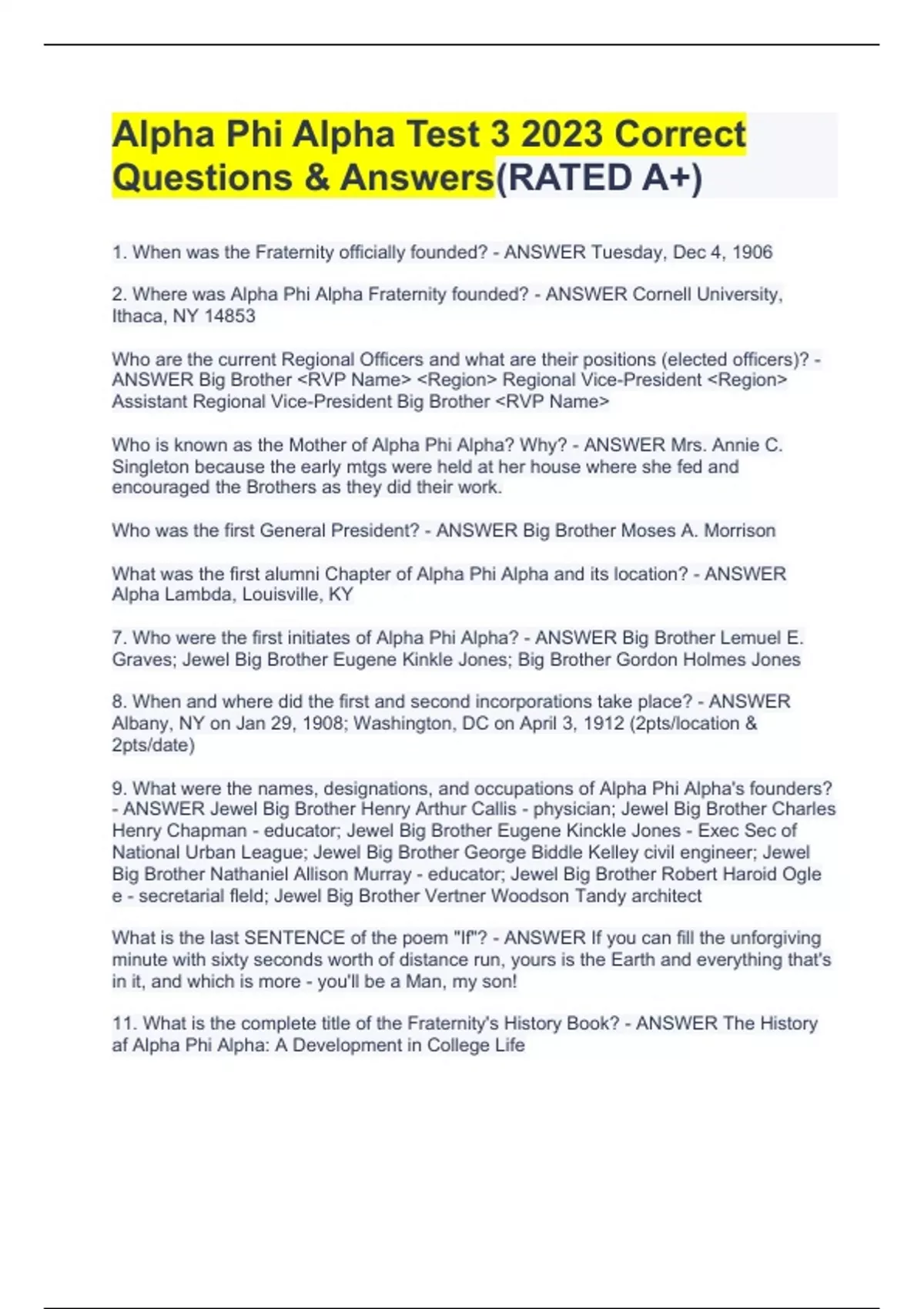1. When was the Fraternity officially founded? - ANSWER Tuesday, Dec 4, 1906 2. Where was Alpha Phi Alpha Fraternity founded? - ANSWER Cornell University, Ithaca, NY 14853 Who are the current Regional Officers and what are their positions (elected officers)? - ANSWER Big Brother <RVP Name> <Region> Regional Vice-President <Region> Assistant Regional Vice-President Big Brother <RVP Name> Who is known as the Mother of Alpha Phi Alpha? Why? - ANSWER Mrs. Annie C. Singleton because the early mtgs were held at her house where she fed and encouraged the Brothers as they did their work. Who was the first General President? - ANSWER Big Brother Moses A. Morrison What was the first alumni Chapter of Alpha Phi Alpha and its location? - ANSWER Alpha Lambda, Louisville, KY 7. Who were the first initiates of Alpha Phi Alpha? - ANSWER Big Brother Lemuel E. Graves; Jewel Big Brother Eugene Kinkle Jones; Big Brother Gordon Holmes Jones 8. When and where did the first and second incorporations take place? - ANSWER Albany, NY on Jan 29, 1908; Washington, DC on April 3, 1912 (2pts/location & 2pts/date) 9. What were the names, designations, and occupations of Alpha Phi Alpha's founders? - ANSWER Jewel Big Brother Henry Arthur Callis - physician; Jewel Big Brother Charles Henry Chapman - educator; Jewel Big Brother Eugene Kinckle Jones - Exec Sec of National Urban League; Jewel Big Brother George Biddle Kelley civil engineer; Jewel Big Brother Nathaniel Allison Murray - educator; Jewel Big Brother Robert Haroid Ogle e - secretarial fleld; Jewel Big Brother Vertner Woodson Tandy architect What is the last SENTENCE of the poem "If"? - ANSWER If you can fill the unforgiving minute with sixty seconds worth of distance run, yours is the Earth and everything that's in it, and which is more - you'll be a Man, my son! 11. What is the complete title of the Fraternity's History Book? - ANSWER The History af Alpha Phi Alpha: A Development in College Life To whom is the History book of Alpha Phi Alpha dedicated? - ANSWER To the youths who march onward and upward toward the light, this volum Alpha Phi Alpha Test 3 2023 Correct Questions & Answers(RATED A+)