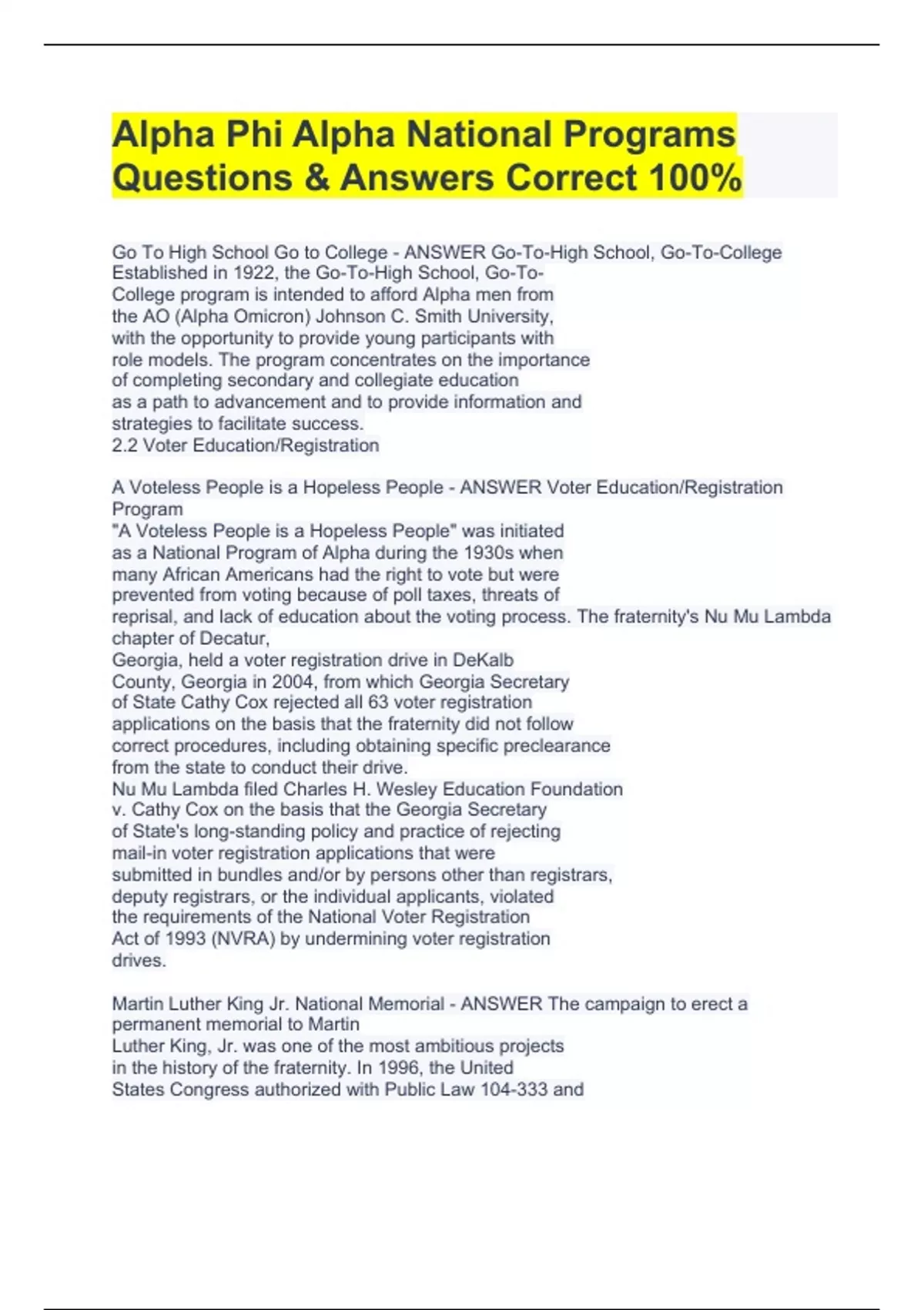 Go To High School Go to College - ANSWER Go-To-High School, Go-To-College Established in 1922, the Go-To-High School, Go-To- College program is intended to afford Alpha men from the ΑΟ (Alpha Omicron) Johnson C. Smith University, with the opportunity to provide young participants with role models. The program concentrates on the importance of completing secondary and collegiate education as a path to advancement and to provide information and strategies to facilitate success. 2.2 Voter Education/Registration A Voteless People is a Hopeless People - ANSWER Voter Education/Registration Program "A Voteless People is a Hopeless People" was initiated as a National Program of Alpha during the 1930s when many African Americans had the right to vote but were prevented from voting because of poll taxes, threats of reprisal, and lack of education about the voting process. The fraternity's Nu Mu Lambda chapter of Decatur, Georgia, held a voter registration drive in DeKalb County, Georgia in 2004, from which Georgia Secretary Alpha Phi Alpha National Programs Questions & Answers Correct 100%