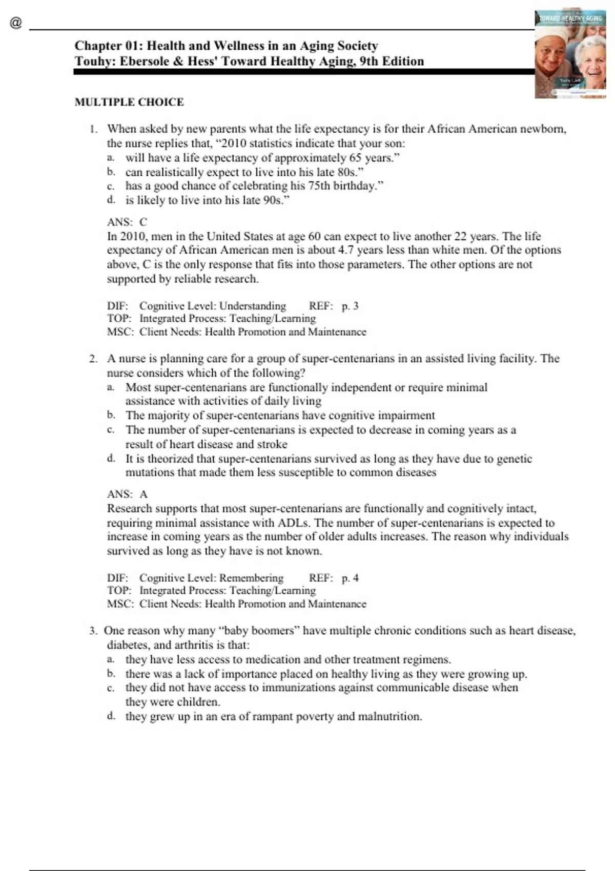 Touhy Ebersole & Hess Toward Healthy Aging, 9th Edition test bank all chapters. Part I: Foundations of Healthy Aging 1. Aging, Health and Wellness in a Global Community 2. Gerontological Nursing: Past, Present, and Future 3. Theories and Processes of Aging 4. Cross-Cultural Caring and Aging 5. Cognition and Learning Part II: Foundations of Caring 6. Communicating with Older Adults 7. Health Assessment 8. Laboratory Diagnostics and Geriatrics 9. Geropharmacology 10. The Use of Dietary Supplements: Focus on Herbal Products Part III: Wellness and Function 11. Vision 12. Hearing 13. Skin Care 14. Nutrition 15. Hydration and Oral Care 16. Elimination 17. Sleep 18. Physical Activity and Exercise 19. Falls and Fall Risk Reduction 20. Safety and Security Part IV: Wellness and Chronic Illness 21. Living Well with Chronic Illness 22. Cardiovascular and Cerebrovascular Health and Wellness 23. Neurodegenerative Disorders 24. Endocrine and Immune Disorders 25. Respiratory Health and Illness 26. Common Musculoskeletal Concerns 27. Pain and Comfort 28. Mental Health 29. Care of Individuals with Neurocognitive Disorders Part V: Healthy Aging for Elders and Their Families 30. Economics and Health Care in Later Life 31. Common Legal and Ethical Issues 32. Long-Term Care 33. Intimacy and Sexuality 34. Relationships, Roles, and Transitions 35. Loss, Death, and Palliative Care 36. Self-Actualization, Spirituality, and Transcendence