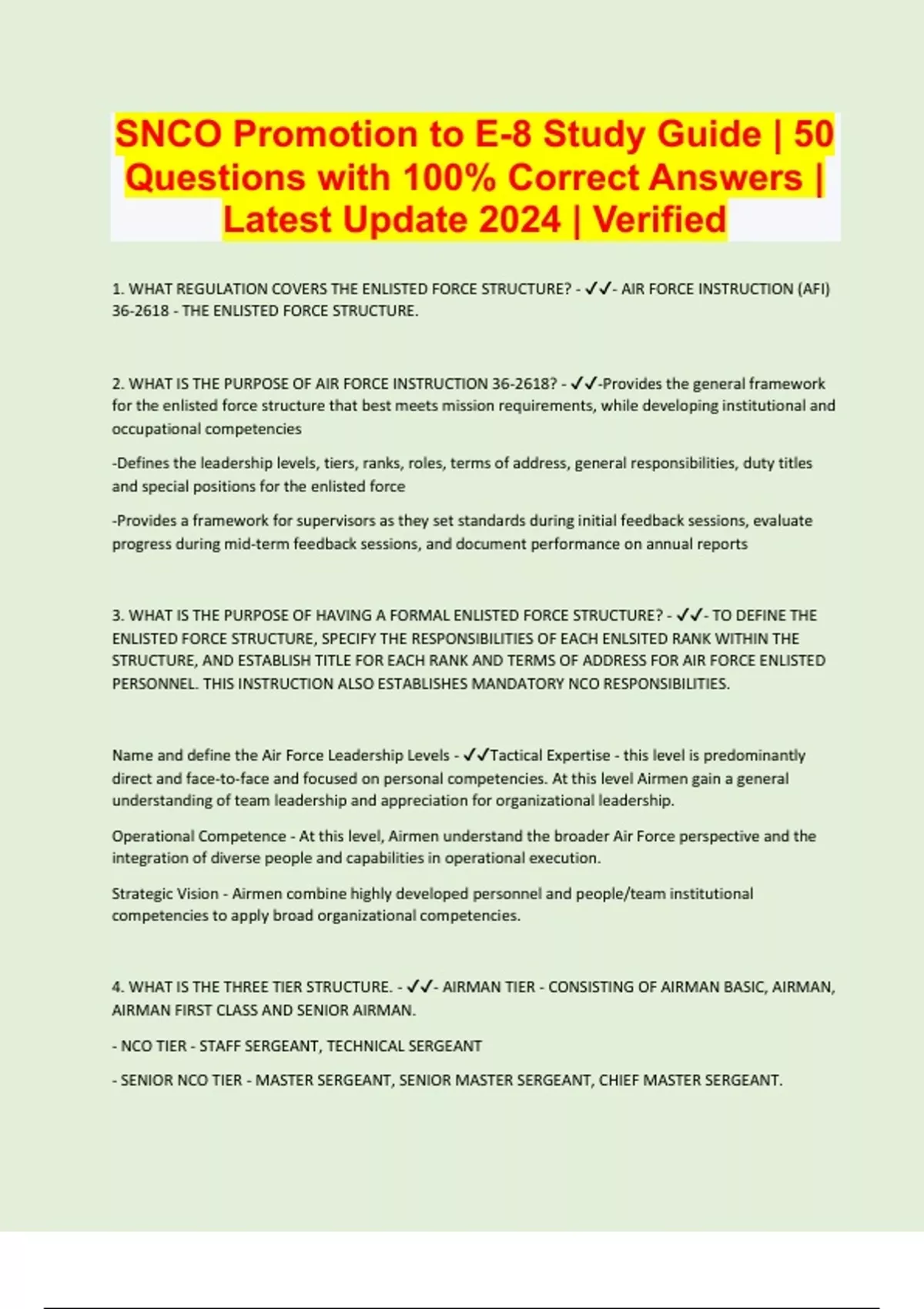 1. WHAT REGULATION COVERS THE ENLISTED FORCE STRUCTURE? - - AIR FORCE INSTRUCTION (AFI) 36-2618 - THE ENLISTED FORCE STRUCTURE. 2. WHAT IS THE PURPOSE OF AIR FORCE INSTRUCTION 36-2618? - -Provides the general framework for the enlisted force structure that best meets mission requirements, while developing institutional and occupational competencies -Defines the leadership levels, tiers, ranks, roles, terms of address, general responsibilities, duty titles and special positions for the enlisted force -Provides a framework for supervisors as they set standards during initial feedback sessions, evaluate progress during mid-term feedback sessions, and document performance on annual reports 3. WHAT IS THE PURPOSE OF HAVING A FORMAL ENLISTED FORCE STRUCTURE? - - TO DEFINE THE ENLISTED FORCE STRUCTURE, SPECIFY THE RESPONSIBILITIES OF EACH ENLSITED RANK WITHIN THE STRUCTURE, AND ESTABLISH TITLE FOR EACH RANK AND TERMS OF ADDRESS FOR AIR FORCE ENLISTED PERSONNEL. THIS INSTRUCTION ALSO ESTABLISHES MANDATORY NCO RESPONSIBILITIES. Name and define the Air Force Leadership Levels - Tactical Expertise - this level is predominantly direct and face-to-face and focused on personal competencies. At this level Airmen gain a general understanding of team leadership and appreciation for organizational leadership. Operational Competence - At this level, Airmen understand the broader Air Force perspective and the integration of diverse people and capabilities in operational execution. Strategic Vision - Airmen combine highly developed personnel and people/team institutional competencies to apply broad organizational competencies. 4. WHAT IS THE THREE TIER STRUCTURE. - - AIRMAN TIER - CONSISTING OF AIRMAN BASIC, AIRMAN, AIRMAN FIRST CLASS AND SENIOR AIRMAN. - NCO TIER - STAFF SERGEANT, TECHNICAL SERGEANT - SENIOR NCO TIER - MASTER SERGEANT, SENIOR MASTER SERGEANT, CHIEF MASTER SERGEANT