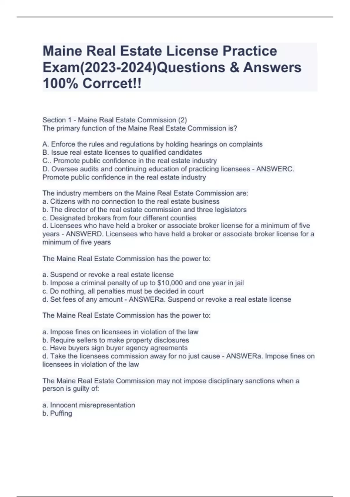 Section 1 - Maine Real Estate Commission (2) The primary function of the Maine Real Estate Commission is? A. Enforce the rules and regulations by holding hearings on complaints B. Issue real estate licenses to qualified candidates C.. Promote public confidence in the real estate industry D. Oversee audits and continuing education of practicing licensees - ANSWERC. Promote public confidence in the real estate industry The industry members on the Maine Real Estate Commission are: a. Citizens with no connection to the real estate business b. The director of the real estate commission and three legislators c. Designated brokers from four different counties d. Licensees who have held a broker or associate broker license for a minimum of five years - ANSWERD. Licensees who have held a broker or associate broker license for a minimum of five years The Maine Real Estate Commission has the power to: a. Suspend or revoke a real estate license b. Impose a criminal penalty of up to $10,000 and one year in jail c. Do nothing, all penalties must be decided in court d. Set fees of any amount - ANSWERa. Suspend or revoke a real estate license The Maine Real Estate Commission has the power to: a. Impose fines on licensees in violation of the law b. Require sellers to make property disclosures c. Have buyers sign buyer agency agreements d. Take the licensees commission away for no just cause - ANSWERa. Impose fines on licensees in violation of the law The Maine Real Estate Commission may not impose disciplinary sanctions when a person is guilty of: a. Innocent misrepresentation b. Puffing c. Class A, B or C crime d. Concealment of pertinent information - ANSWERa. Innocent misrepresentation Iris Clover has been an active Associate Broker licensee in Maine for nine years. She may a. Open her own real estate brokerage company b. Serve on the Maine Real Estate Commission as an industry member c. Not apply for the broker license for 1 more year d. Not provide a broker price opinion for a bank - ANSWERb. Serve on the Maine Real Estate Commission as an industry member The Maine Real Estate Commission has how many members? a. 4 b. 6 c. 5 d. 7 - ANSWERB. 6 The Maine Real Estate Commission has how many industry members? a. 2 b. 4 c. 6 d. 8 - ANSWERB. 4 A licensee may lose their license for conduct which shows a. Dishonesty b. Dealing in bad faith c. Incompetency d. All of the above - ANSWERD. All of the above. Dishonest, dealing in bad faith, incompetency Leo Allster is a licensee who was convicted of embezzlement of funds from his De