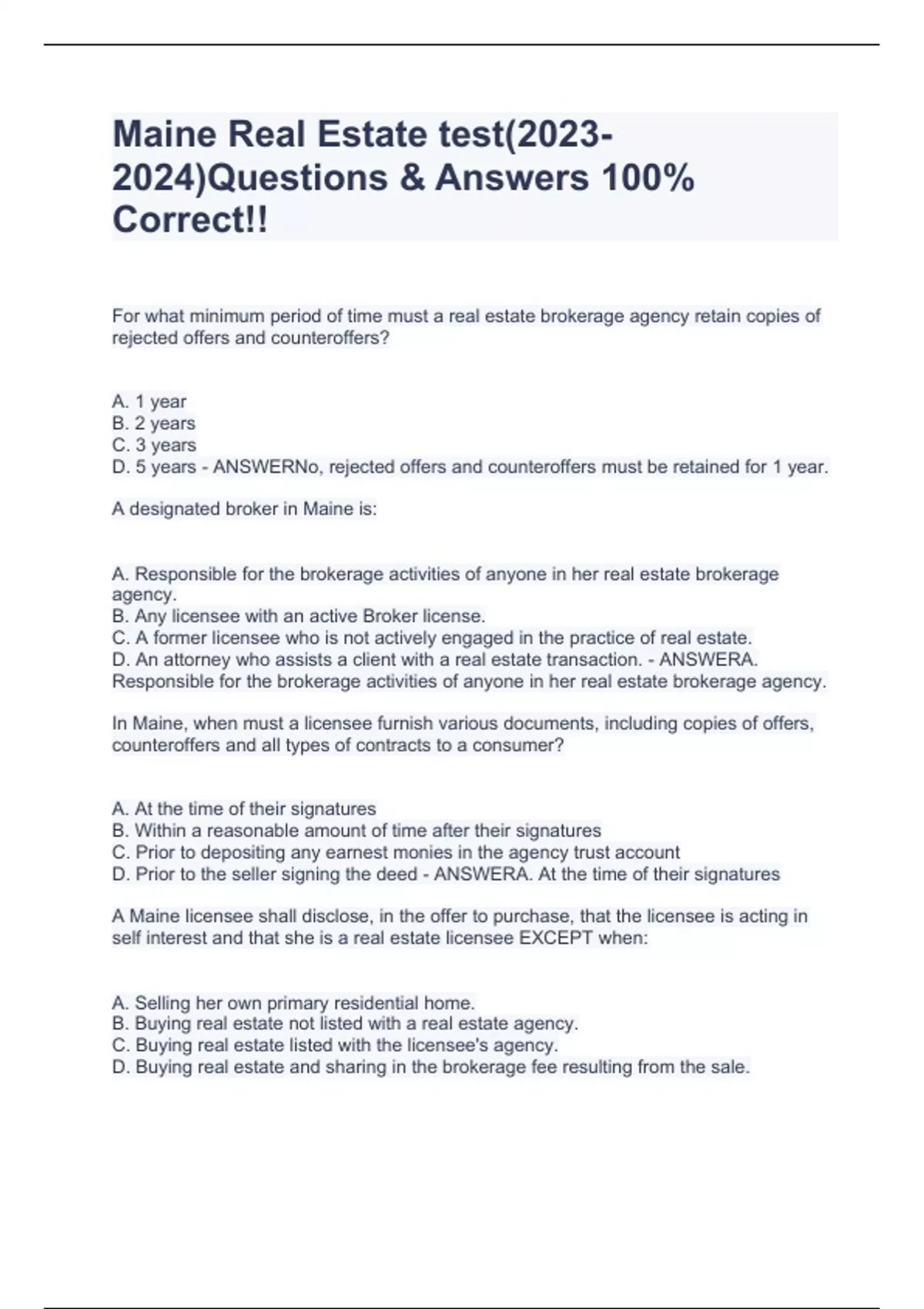 For what minimum period of time must a real estate brokerage agency retain copies of rejected offers and counteroffers? A. 1 year B. 2 years C. 3 years D. 5 years - ANSWERNo, rejected offers and counteroffers must be retained for 1 year. A designated broker in Maine is: A. Responsible for the brokerage activities of anyone in her real estate brokerage agency. B. Any licensee with an active Broker license. C. A former licensee who is not actively engaged in the practice of real estate. D. An attorney who assists a client with a real estate transaction. - ANSWERA. Responsible for the brokerage activities of anyone in her real estate brokerage agency. In Maine, when must a licensee furnish various documents, including copies of offers, counteroffers and all types of contracts to a consumer? A. At the time of their signatures B. Within a reasonable amount of time after their signatures C. Prior to depositing any earnest monies in the agency trust account D. Prior to the seller signing the deed - ANSWERA. At the time of their signatures A Maine licensee shall disclose, in the offer to purchase, that the licensee is acting in self interest and that she is a real estate licensee EXCEPT when: A. Selling her own primary residential home. B. Buying real estate not listed with a real estate agency. C. Buying real estate listed with the licensee's agency. D. Buying real estate and sharing in the brokerage fee resulting from the sale. Your answer: C. Buying real estate listed with the licensee's agency. No, the correct answer is - ANSWERA. When buying property, a licensee is required by Maine law to disclose that she is a licensee In Maine, a licensee is NOT required to provide a copy of the Real Estate Brokerage Relationships Form to a prospective buyer or seller: A. For a property with less than 1 or more than 4 residential dwelling units. B. If the licensee is acting solely as a principal, not as an agent for another. C. When the written communication from the licensee is a solicitation of business. D. All of the above. Your answer: . Yes, this is the correct answer as answers A, B and C are all correct. - ANSWERD. All of the above Under Maine law, "real estate brokerage' means: A. The full-time practice of real estate over a two year period. B. To act solely for the client of a real estate agency to the exclusion of other affiliated licensees. C. A single instance of offering, attempting to conduct, or conducting real estate services on behalf of another for compensation. D. Any entity providing real estate services. - ANSWERC. The definition of real estate brokerage is a single instance of offering, attempting to conduct, or conducting real estate services on behalf of another for compensation. In Maine an agency that has a company policy that permits disclosed dual agency must provide a disclosed dual agency consent agreement to:
