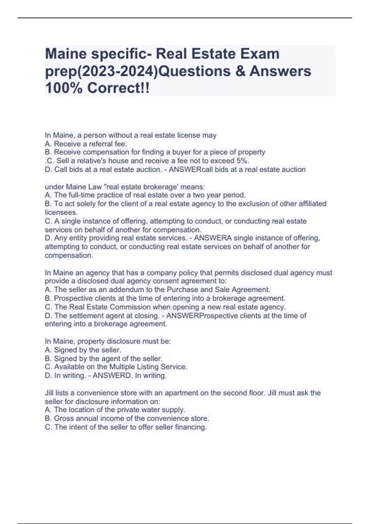 In Maine, a person without a real estate license may A. Receive a referral fee. B. Receive compensation for finding a buyer for a piece of property .C. Sell a relative's house and receive a fee not to exceed 5%. D. Call bids at a real estate auction. - ANSWERcall bids at a real estate auction under Maine Law "real estate brokerage' means: A. The full-time practice of real estate over a two year period. B. To act solely for the client of a real estate agency to the exclusion of other affiliated licensees. C. A single instance of offering, attempting to conduct, or conducting real estate services on behalf of another for compensation. D. Any entity providing real estate services. - ANSWERA single instance of offering, attempting to conduct, or conducting real estate services on behalf of another for compensation. In Maine an agency that has a company policy that permits disclosed dual agency must provide a disclosed dual agency consent agreement to: A. The seller as an addendum to the Purchase and Sale Agreement. B. Prospective clients at the time of entering into a brokerage agreement. C. The Real Estate Commission when opening a new real estate agency. D. The settlement agent at closing. - ANSWERProspective clients at the time of entering into a brokerage agreement. In Maine, property disclosure must be: A. Signed by the seller. B. Signed by the agent of the seller. C. Available on the Multiple Listing Service. D. In writing. - ANSWERD. In writing. Jill lists a convenience store with an apartment on the second floor. Jill must ask the seller for disclosure information on: A. The location of the private water supply. B. Gross annual income of the convenience store. C. The intent of the seller to offer seller financing. D. How long the seller has operated a store on the property. - ANSWERThe location of the private water supply. Which of the following must a buyer agent disclose to his client regarding the heating system in a residential property? A. The current price per gallon for heating fuel B. The advisability of replacing electric baseboard heat C. Malfunctions within the past two years