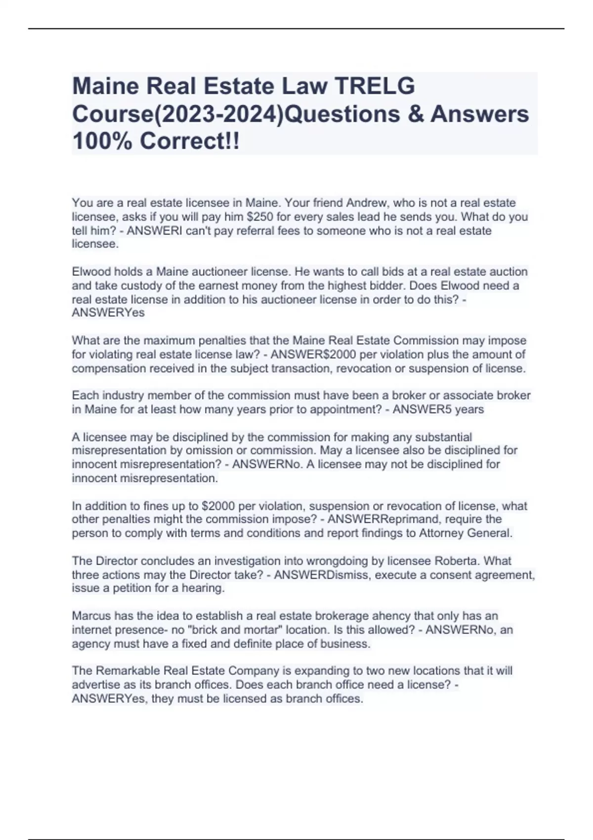 Maine Real Estate Law TRELG Course()Questions & Answers 100% Correct!!
